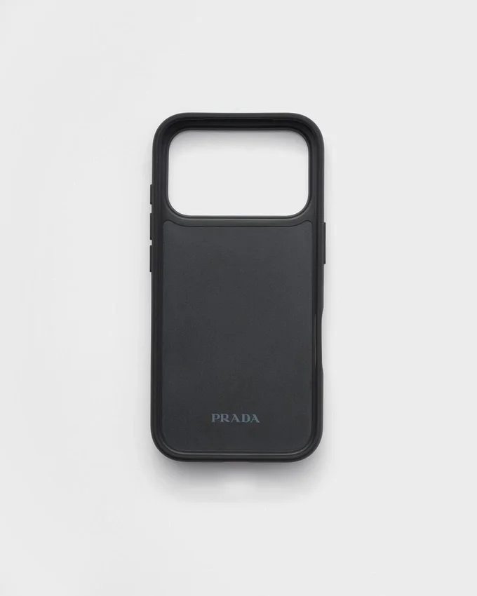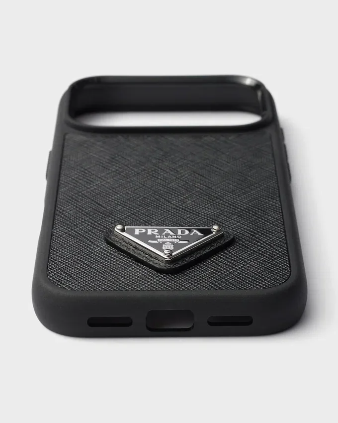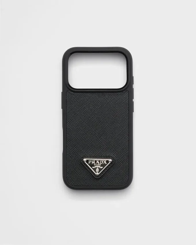 This Iphone 17 Pro Cover Made of Saffiano Leather Has a Sleek, Refined Design Decorated with the Emblematic Enameled Metal Triangle Logo.