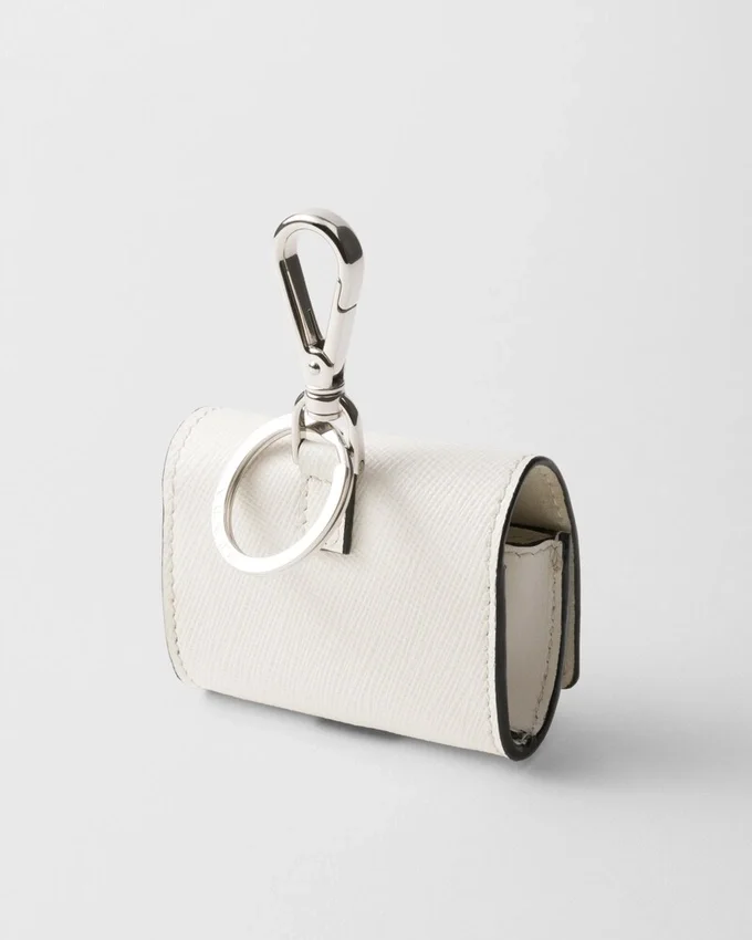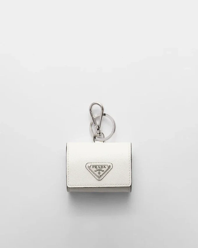 Made of Saffiano Leather, a Brand Hallmark, This Headphone Case is Defined by the Enamel Triangle Logo on the Front. The Accessory Has a Metal Snap-Hook and Ring.