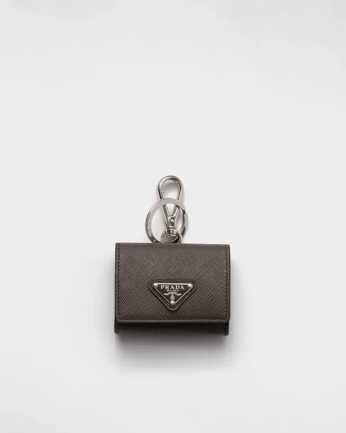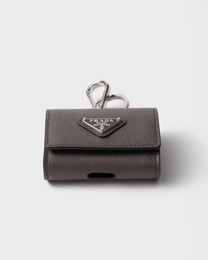 Made of Saffiano Leather, a Brand Hallmark, This Headphone Case is Defined by the Enamel Triangle Logo on the Front. The Accessory Has a Metal Snap-Hook and Ring.