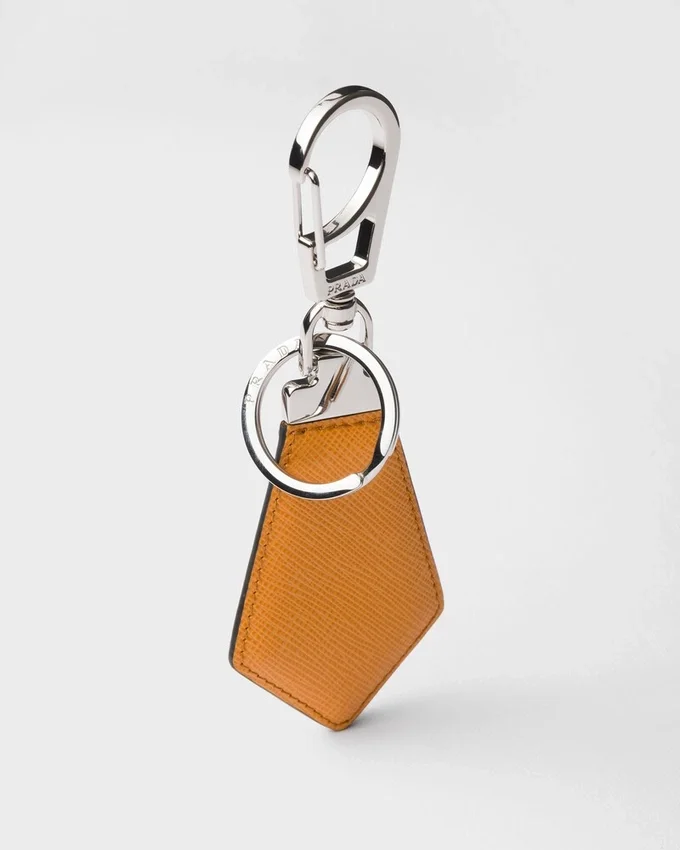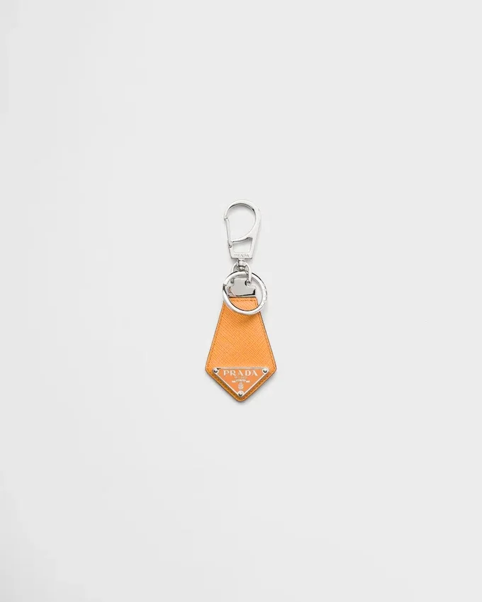This Elegant Keychain is Built from Saffiano Leather in the Shape of a Tie. Embellished with the Triangular Prada Logo, It Offers a Hook and Split Ring for Attaching Keys.