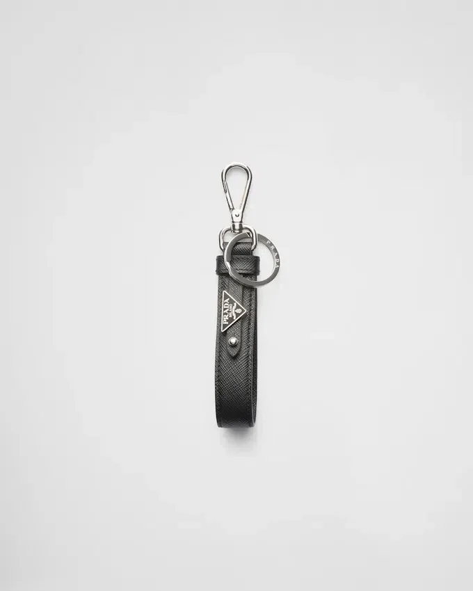 This Saffiano Leather Keychain is Decorated with a Removable Enameled Metal Triangle Logo, Which Adds an Iconic Note to the Design. The Accessory Can Be Customized at Prada Stores with Interchangeable Letters and Charms, for a Unique and Original Twist.