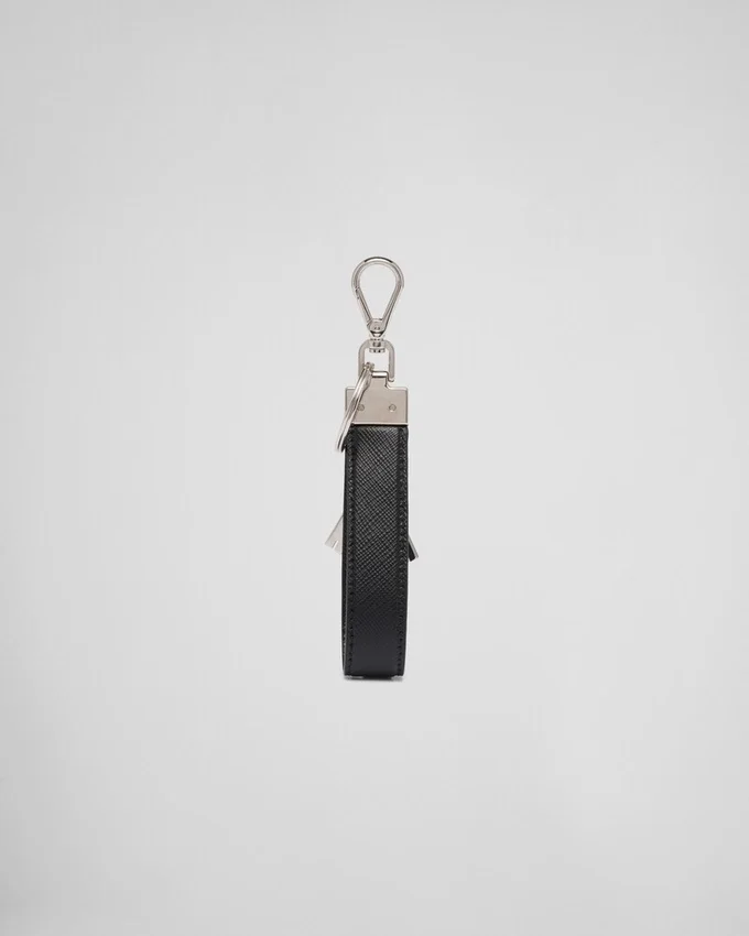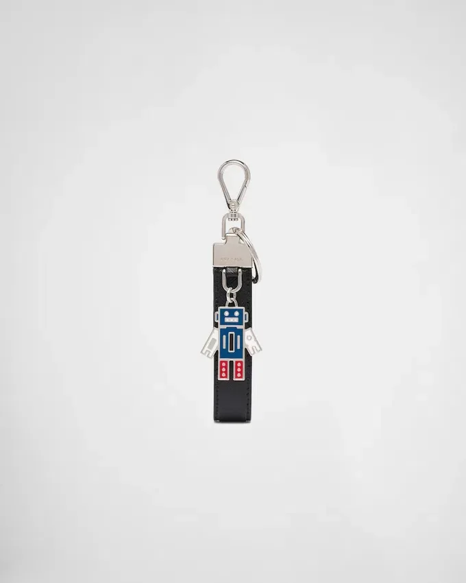 A Saffiano Leather Keychain with a Whimsical Enameled Metal Charm. The Polished Steel Hardware Includes a Split Ring and a Metal Hook.