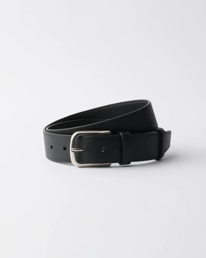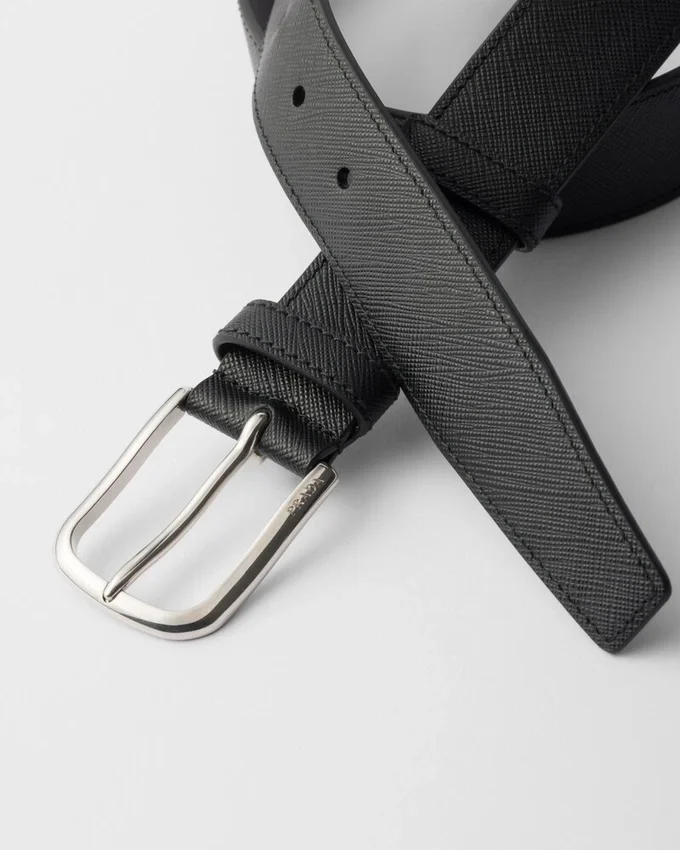 Unmistakable Saffiano Leather Enriches This Belt with a Sleek Design and Versatile Style. Its Emblematic Crosshatch Texture with Waxed Finish Adds a Distinctive Note to the Contemporary Accessory.
