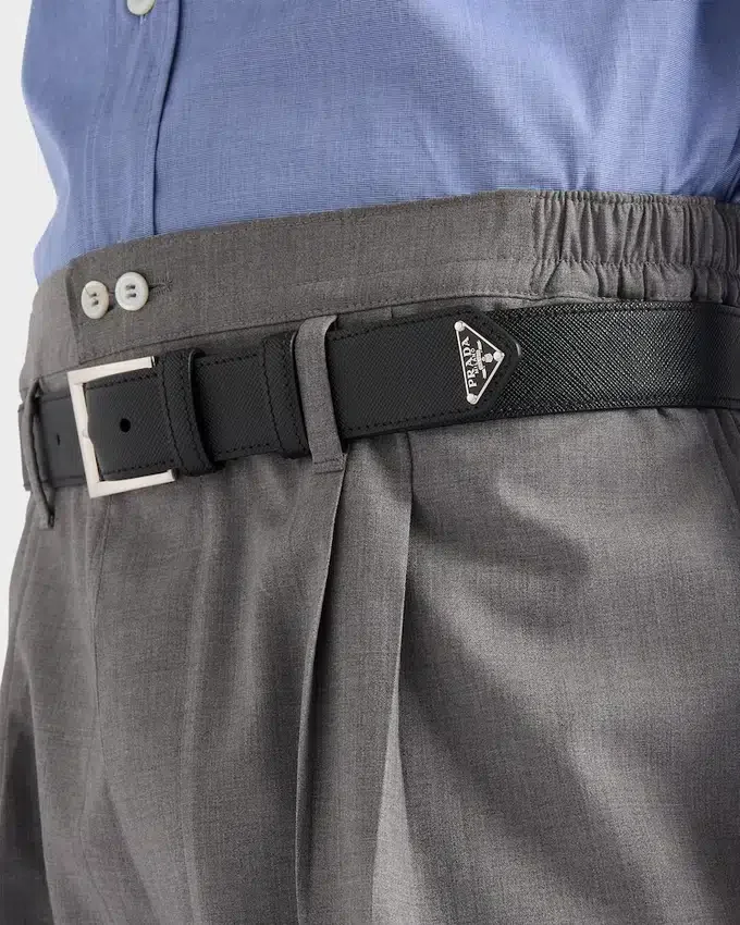 A Sleek and Refined Design Characterizes This Saffiano Leather Belt Decorated with the Iconic Enameled Metal Triangle Logo.