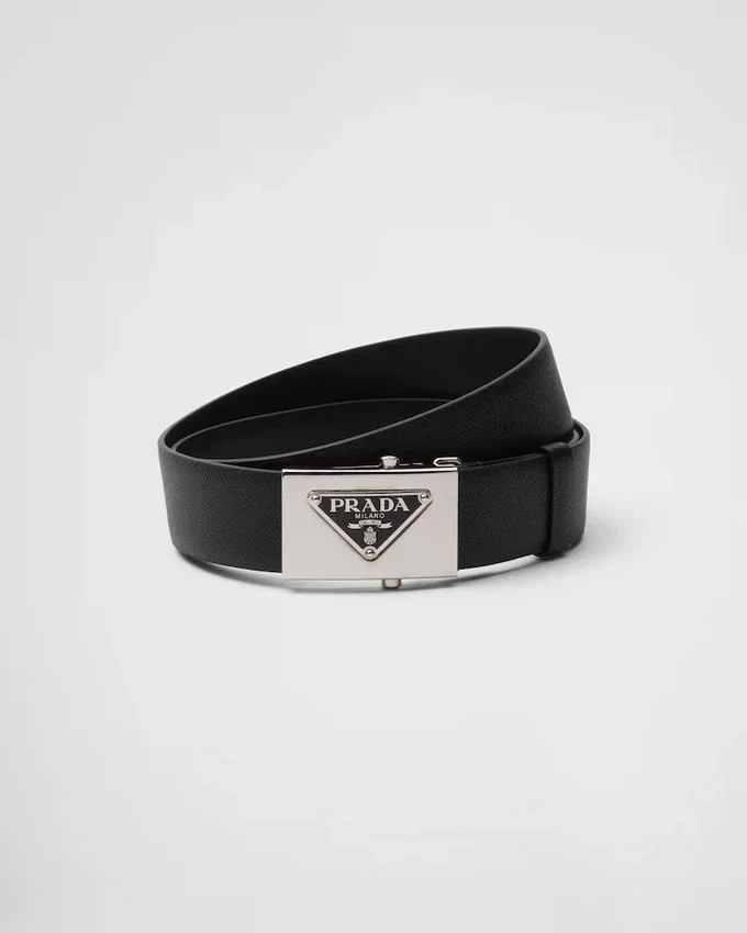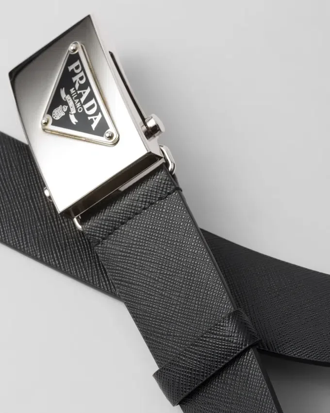 This Belt Features a Sleek Design Enriched with the Unmistakable Crosshatch Texture of Saffiano Leather. The Accessory is Completed by a Plaque Buckle Embellished with the Iconic Geometric Shape of the Enameled Metal Triangle Logo.
