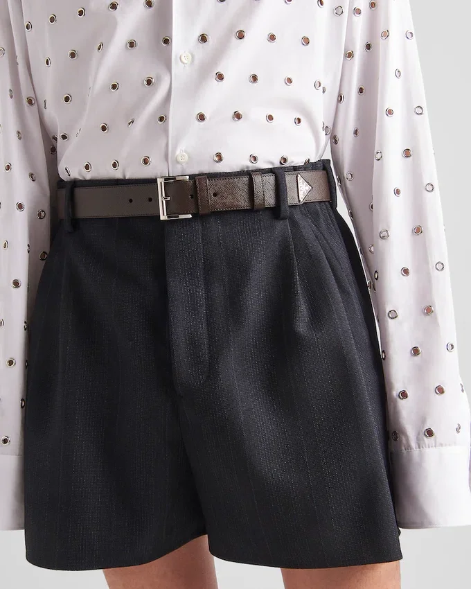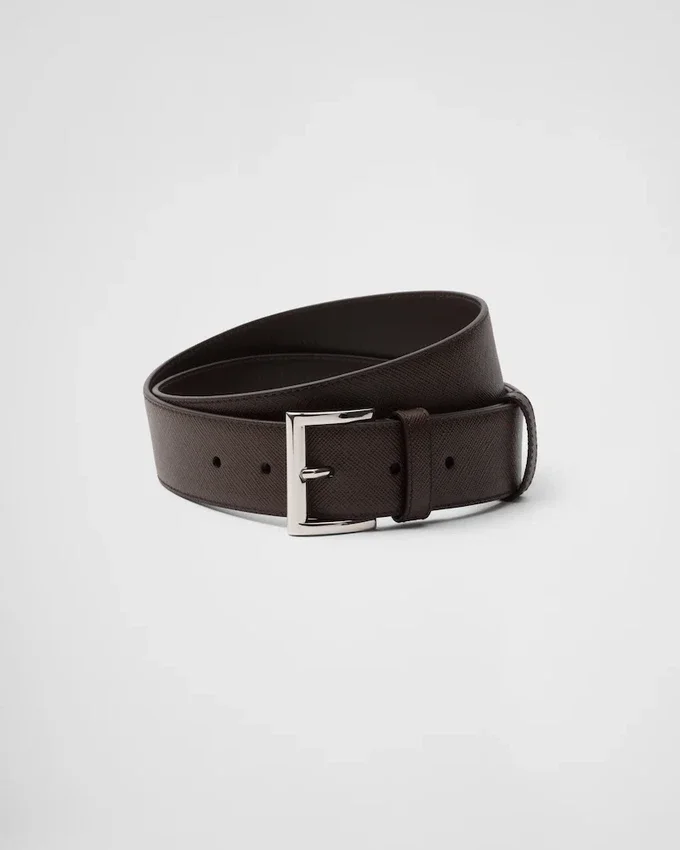 This Belt Characterized by a Sleek, Refined Design is Completed with a Metal Buckle and Decorated with the Triangle Logo That Stands out on the Tip. The Design is Made from the Brand’s Iconic Saffiano Leather, Which is Defined by Its Waxed Finish and Crosshatch Texture.