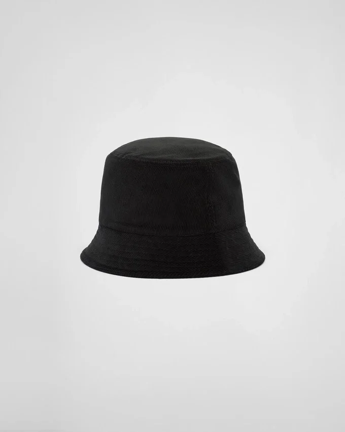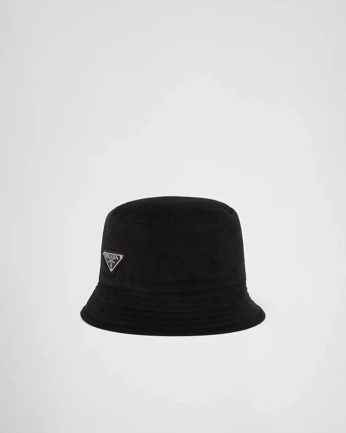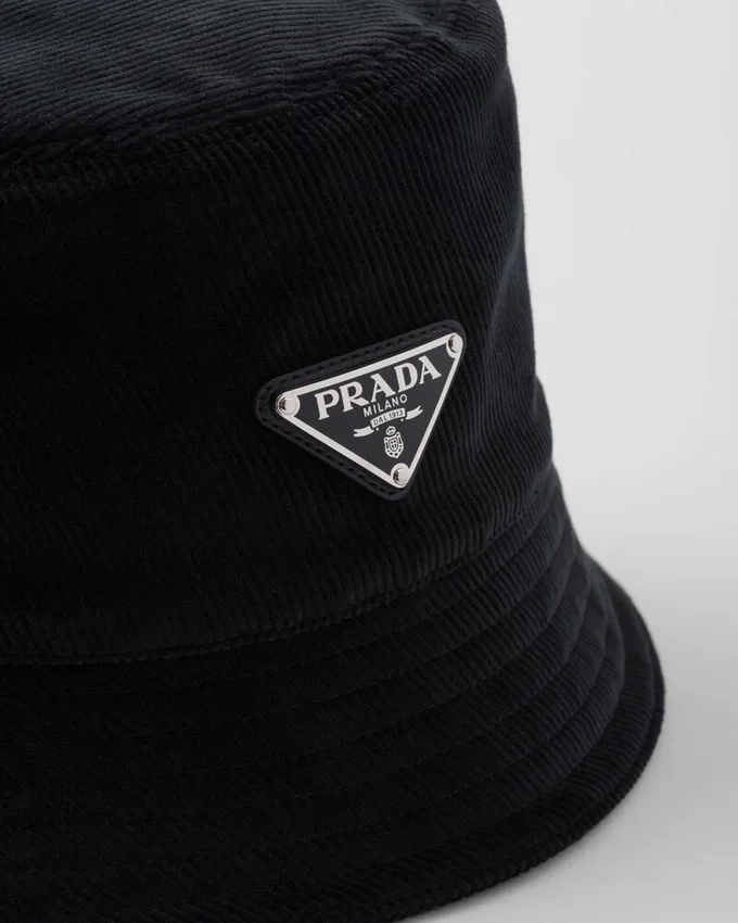 The Bucket Hat, an Iconic Accessory That Distinguishes the Prada Accessories Collection, is Made of Corduroy and Embellished with the Enameled Metal Triangle Logo.