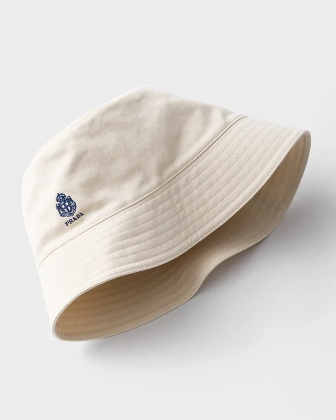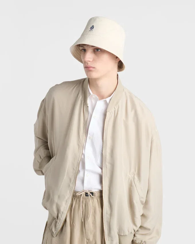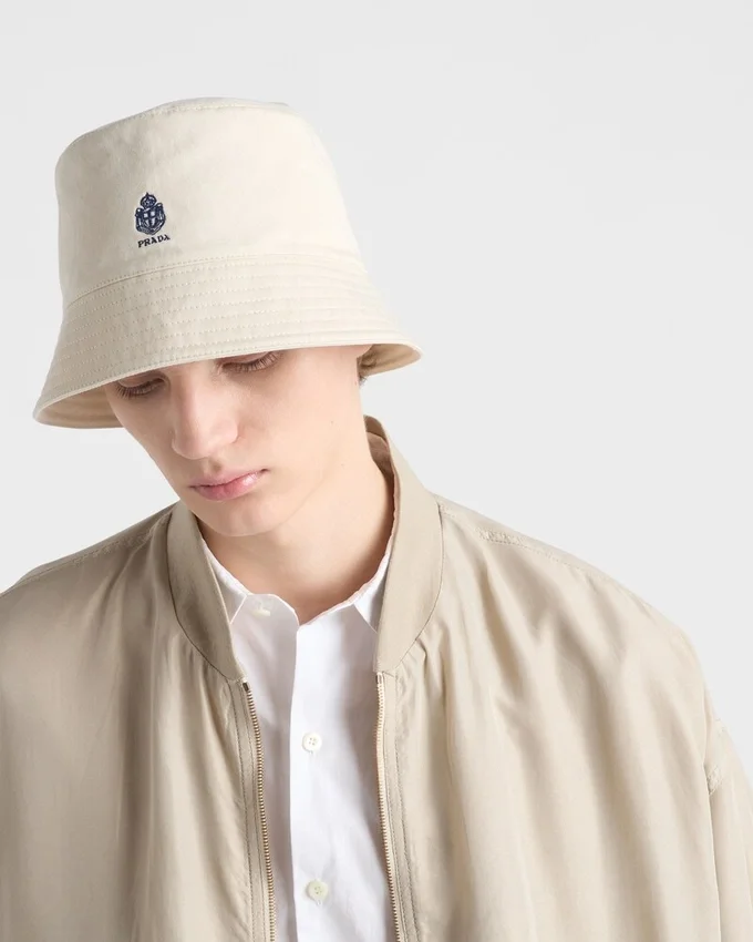 This Refined, Summery Interpretation of the Iconic Bucket Hat is Made of Gabardine with a Vintage Finish. The Embroidered Logo in a Contrasting Color Enhances the Accessory with a Timeless Note.