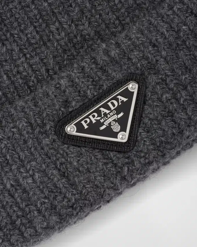 This Beanie with a Sleek, Classic Design is Made from a Fine Wool and Cashmere Blend Yarn for Warmth and Softness. The Emblematic Enameled Metal Triangle Logo Completes the Accessory with a Distinctive Note.