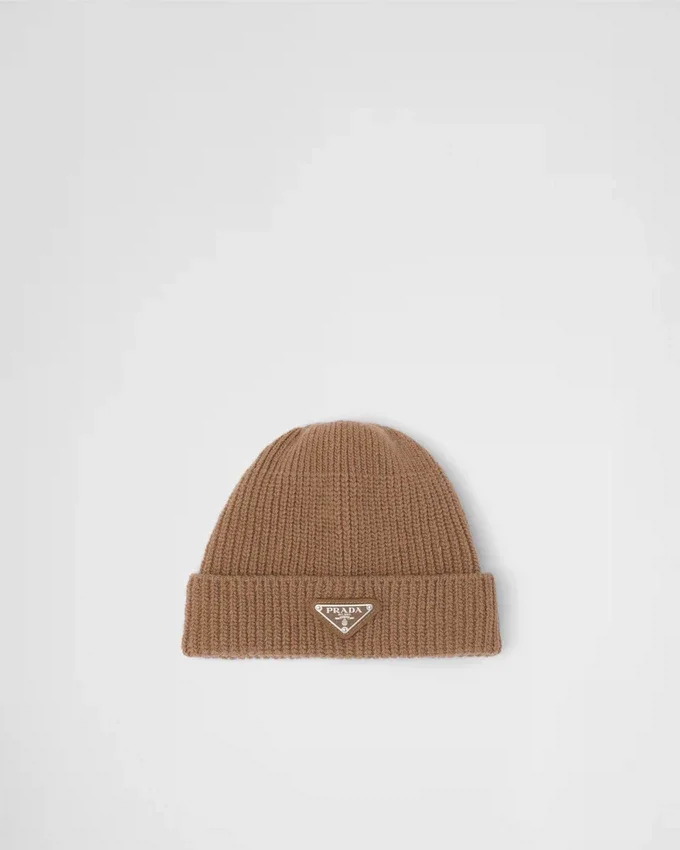 This Elegant, Modern Beanie is Made of Fine Wool and Cashmere. The Iconic Enameled Metal Triangle Logo Stands out on a Leather Triangle Patch.