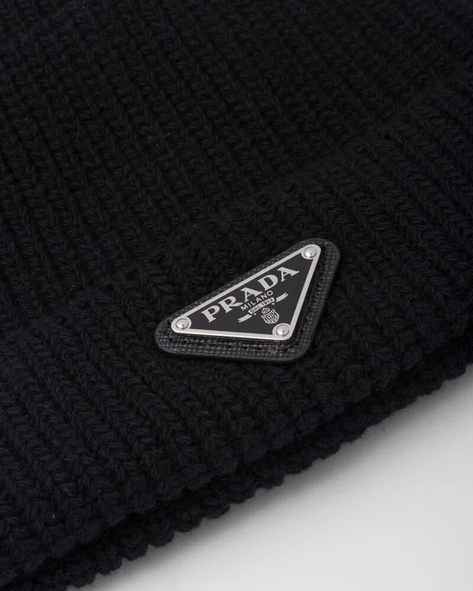 This Beanie with a Sleek, Classic Design is Made from a Fine Wool and Cashmere Blend Yarn for Warmth and Softness. The Emblematic Enameled Metal Triangle Logo Completes the Accessory with a Distinctive Note.