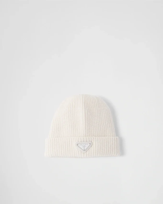 This Beanie with a Sleek, Classic Design is Made from a Fine Wool and Cashmere Blend Yarn for Warmth and Softness. The Emblematic Enameled Metal Triangle Logo Completes the Accessory with a Distinctive Note.