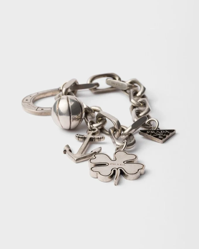 The Use of Symbols as Amulets and Decorations Inspires This Metal Bracelet with an Original Design. A Chunky Chain Characterizes the Bracelet Enriched with Oversized Charms That Recall Different Aesthetic Worlds. The Antiqued Triangle Logo Completes the Ironic and Distinctive Accessory.