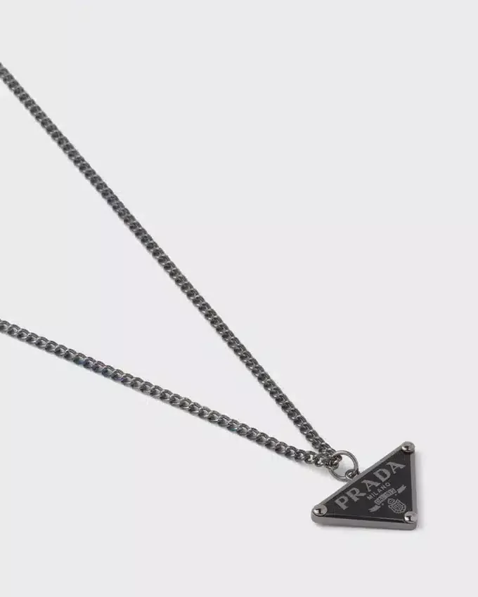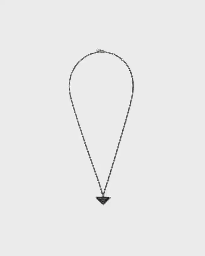 Prada’s Historical Symbol in Enamel is Featured on the Pendant of This Chain Necklace with a Palladium Finish. Iconic and Essential in Form, the Triangle Logo is the Protagonist of a New Line of Jewelry Made of 925 Sterling Silver That Reinterprets Punk Influences in a Modern Way.