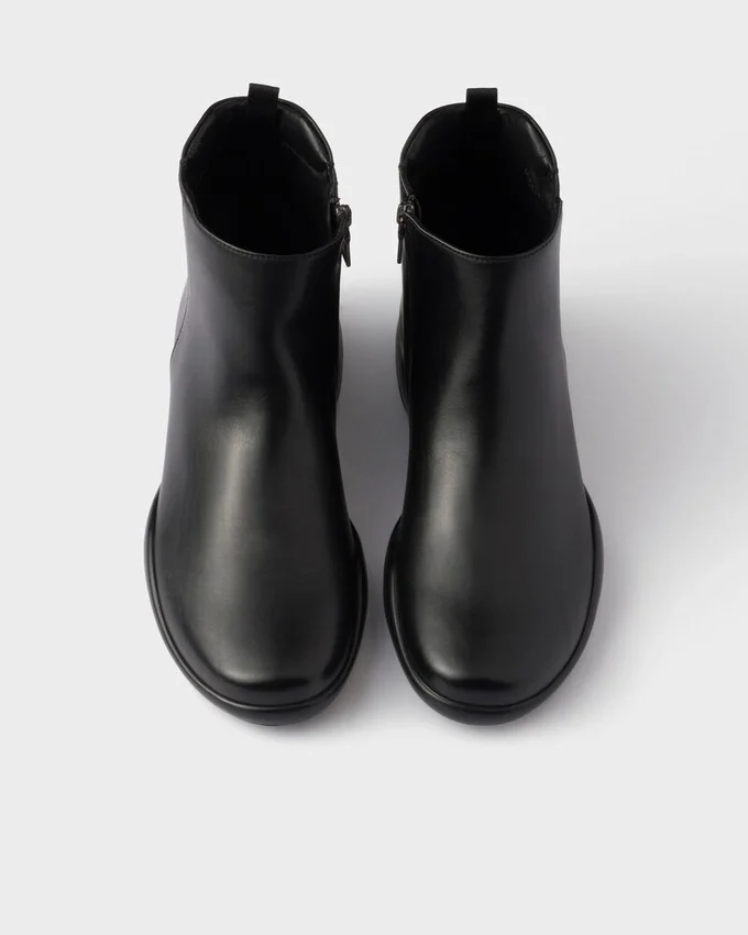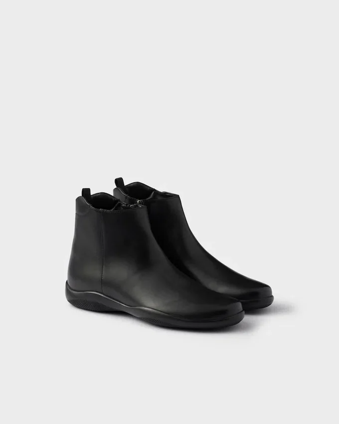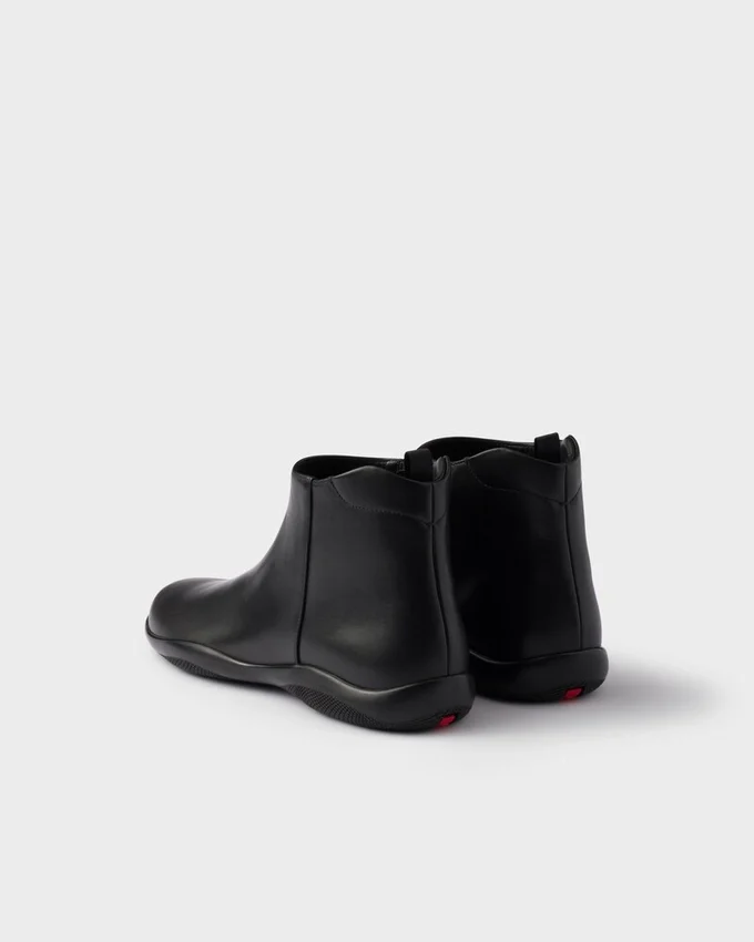 These Sporty, Minimalist High-Top Sneakers Are Inspired by the Iconic Prada Linea Rossa Archive Style Presented During the 1998 Fall/Winter Show. The Innovative, Dual Character of the Original Design is Recalled by the Revolutionary Rubber Soles, While the Matte Leather Introduces a Refined Modern Touch. The Sleek, Tapered Shoes Are Decorated with the Distinctive Linea Rossa Logo.