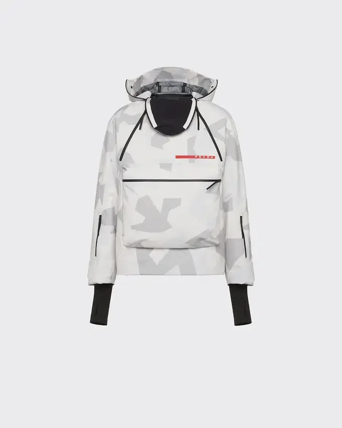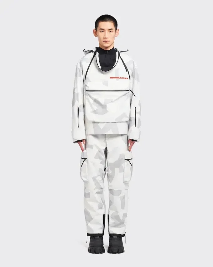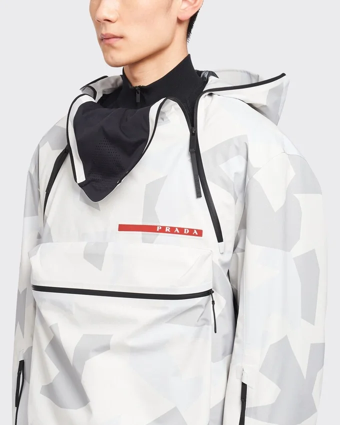 This Snowboard Jacket Featuring a Print Inspired by Arctic Camouflage Used in Snowy Landscapes, is Made of Technical Fabric, a Triple-Layer Bonded Polyester Material Designed to Ensure Excellent Protection Against Water and Wind and Maintain Optimum Breathability. The Iconic Prada Linea Rossa Latex Rubber Logo Label Decorates the Garment.