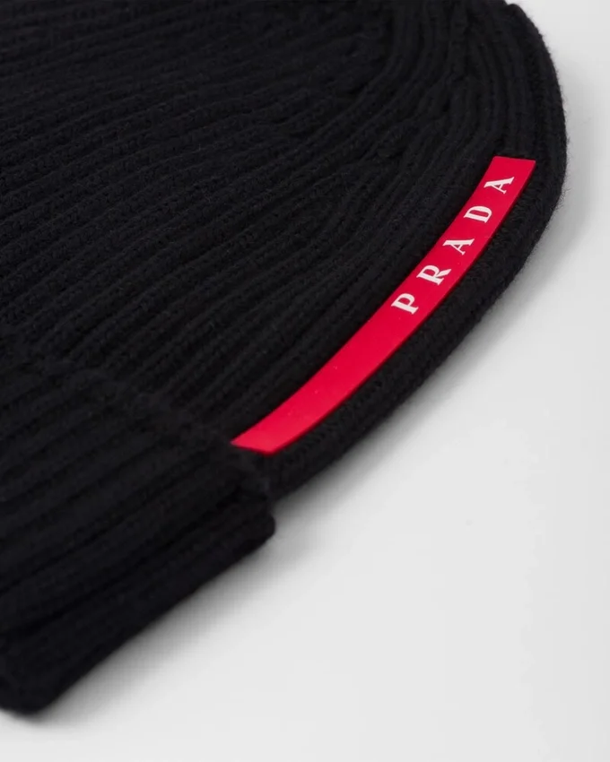 This Ribbed Wool Beanie is Defined by the Distinctive Prada Linea Rossa Latex Logo.