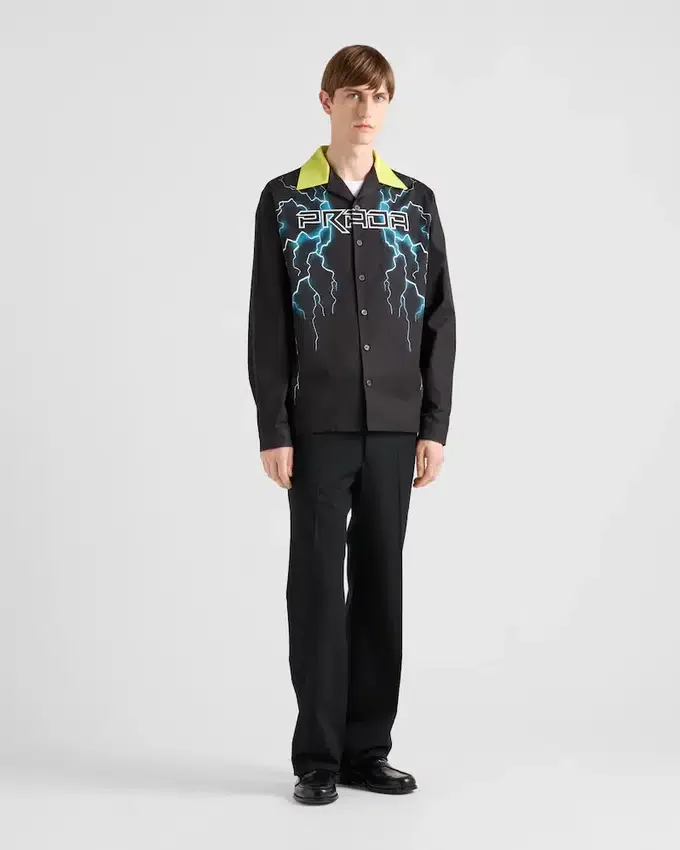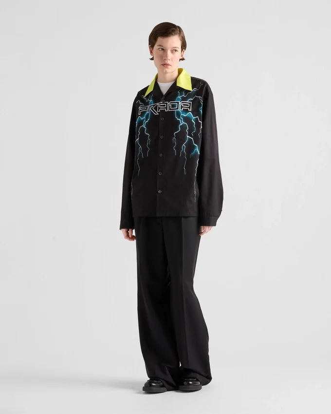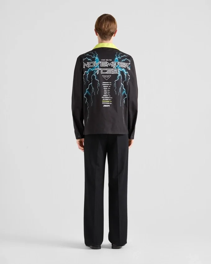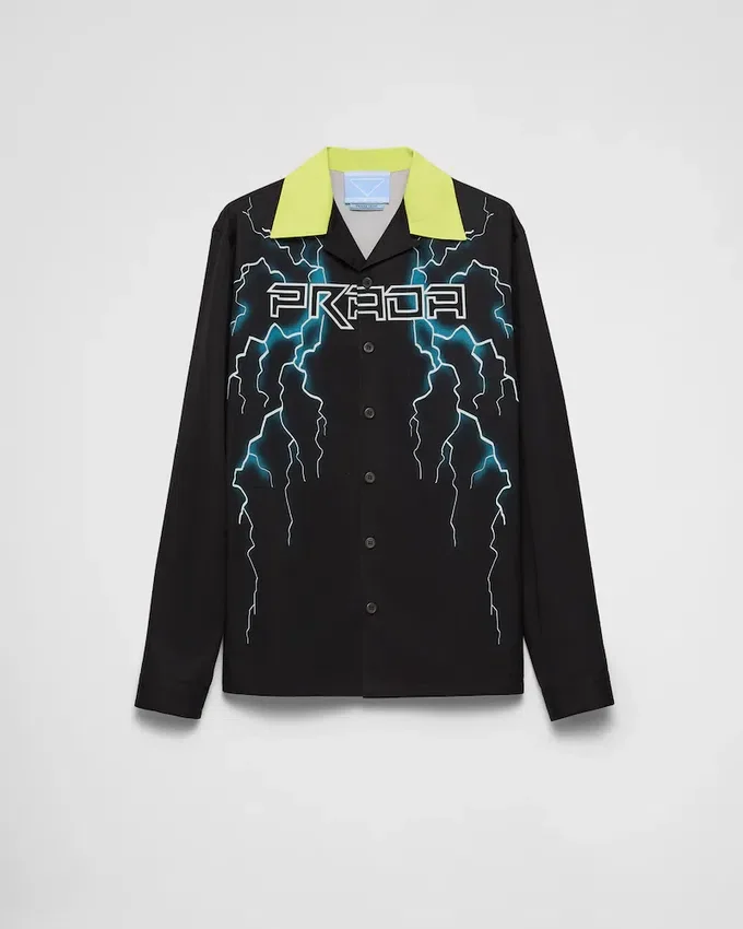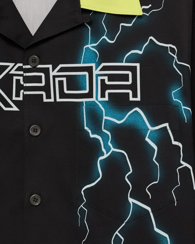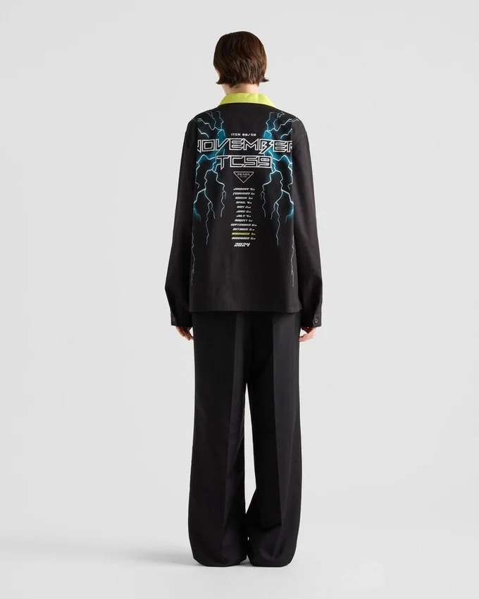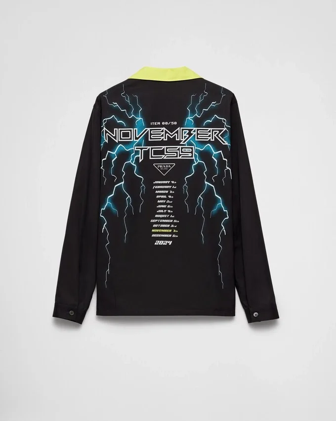 For the Timecapsule Drop #59, Prada Presents the Second of a Series of Three Limited Edition Shirts Characterized by Striking Graphic Art. The Exclusive Print Combines the Electric Vibe and Symbolism of Heavy Metal Music with a Retro-Style Silhouette Defined by the Bowling Collar. Available Exclusively Online for Just 24 Hours, the Drop Includes the Timecapsule Shirt and Its Nft Digital Version That Lets You Become Part of Prada’s Exclusive Crypted Nft Community.