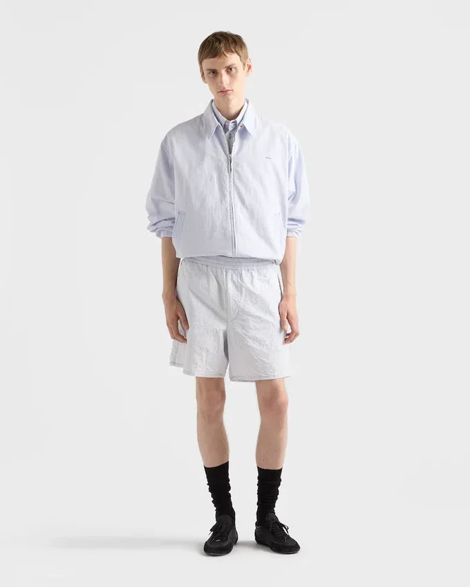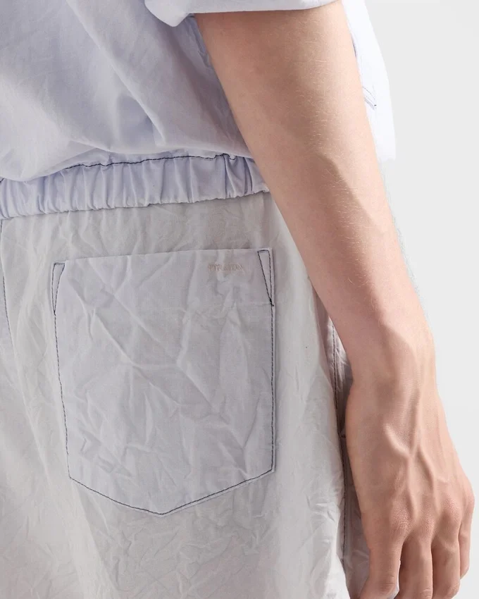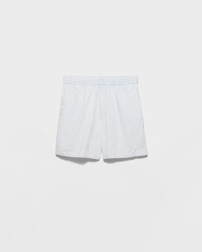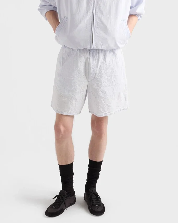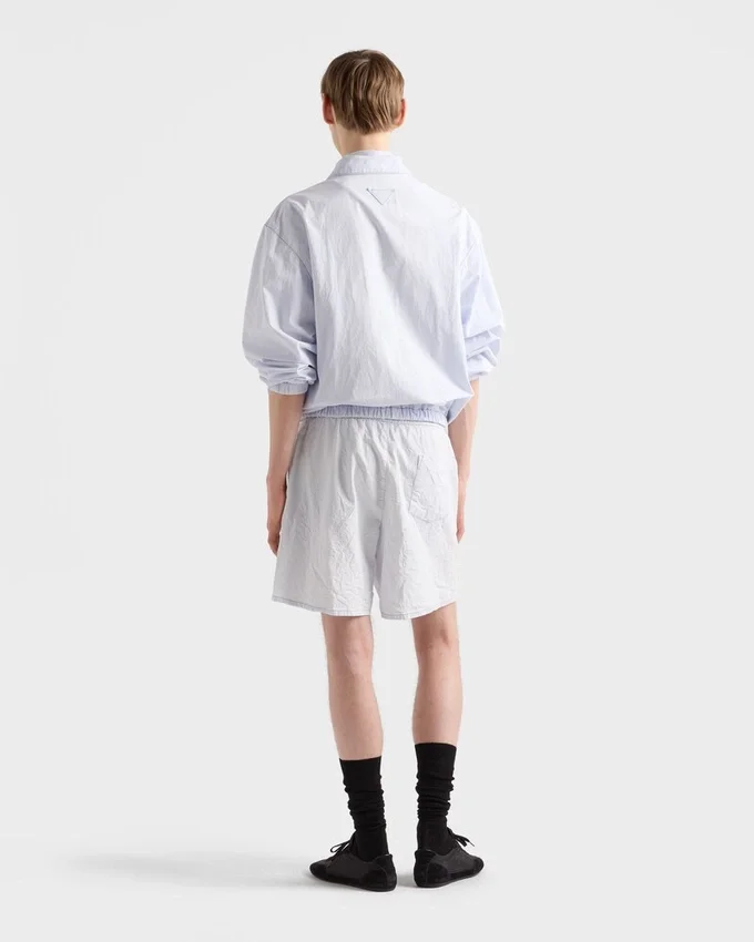 Made of Chambray, a Fabric That Stands out for Its Lightness and Durability, These Bermudas Have a Straight Cut and Treatment That Gives It a Vintage Look. The Prada Logo is Embroidered on the Garment.