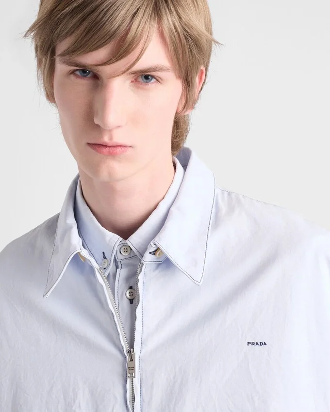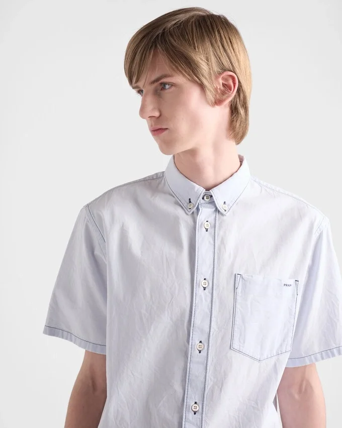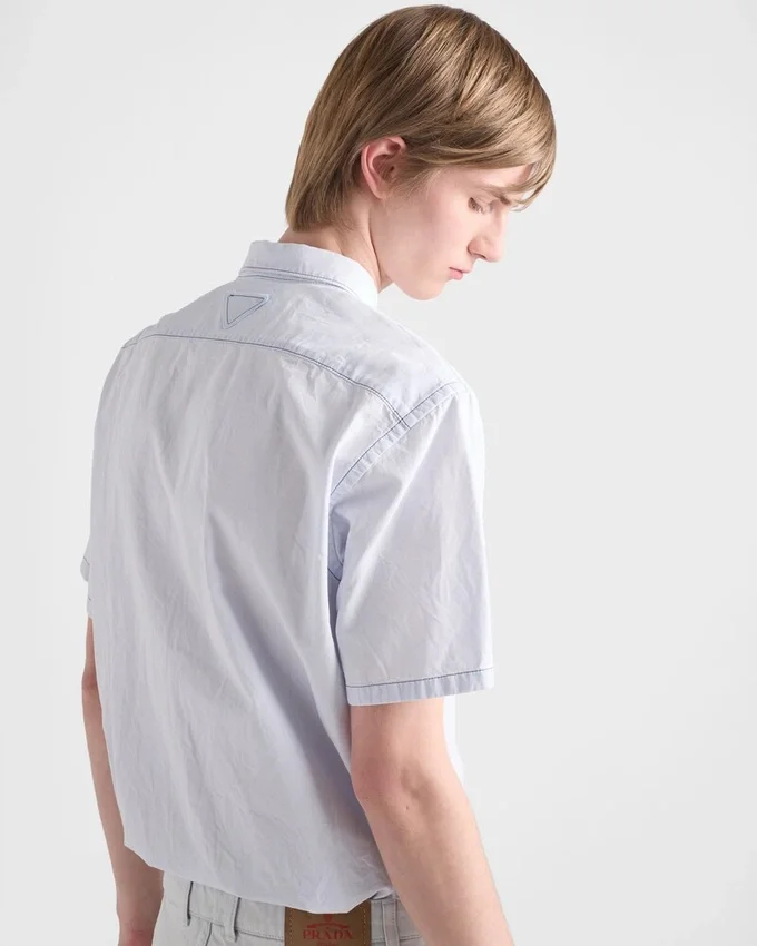 A Soft Feel and Fine Texture Make This Short-Sleeved Chambray Shirt a Structured Garment Perfect for Summer. The Classic Silhouette Expresses Timeless Allure While the Fabric Triangle Logo Adds an Iconic Note.
