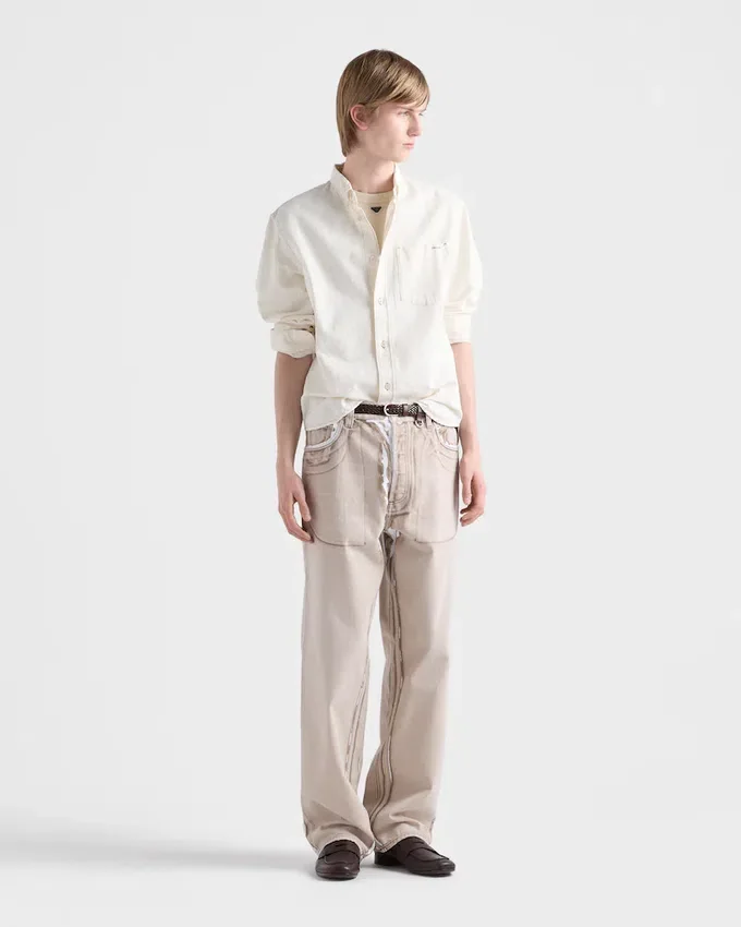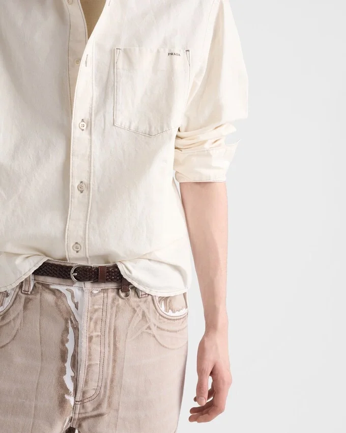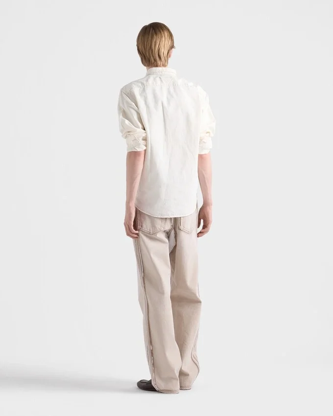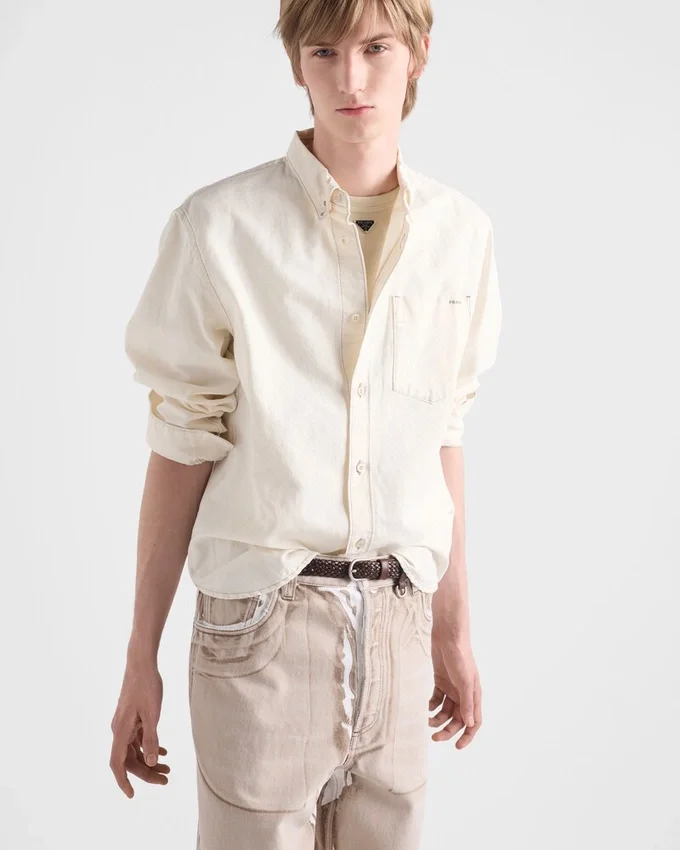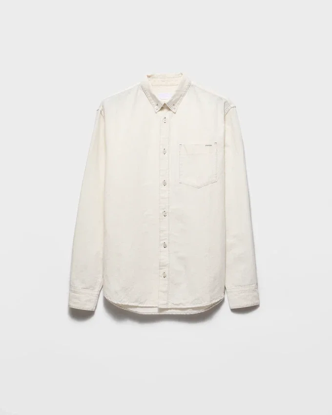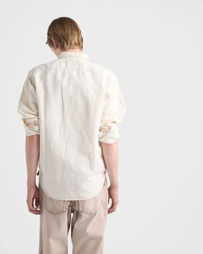 A Soft Feel and Fine Texture Make This Chambray Shirt a Structured Garment Perfect for Summer. The Classic Silhouette Expresses Timeless Allure, While the Fabric Triangle Logo Adds an Iconic Note.