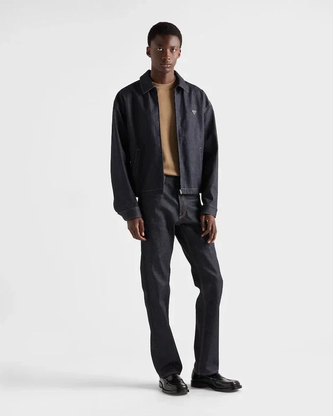 This Versatile and Contemporary Blouson Jacket Made of Raw Denim Has a Sleek Design Characterized by Contrasting Top-Stitching. The Sophisticated, Casual Garment is Completed with the Enameled Metal Triangle Logo.