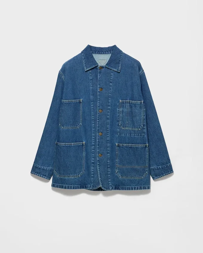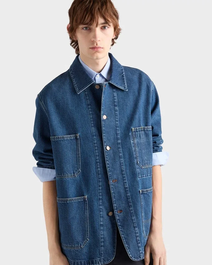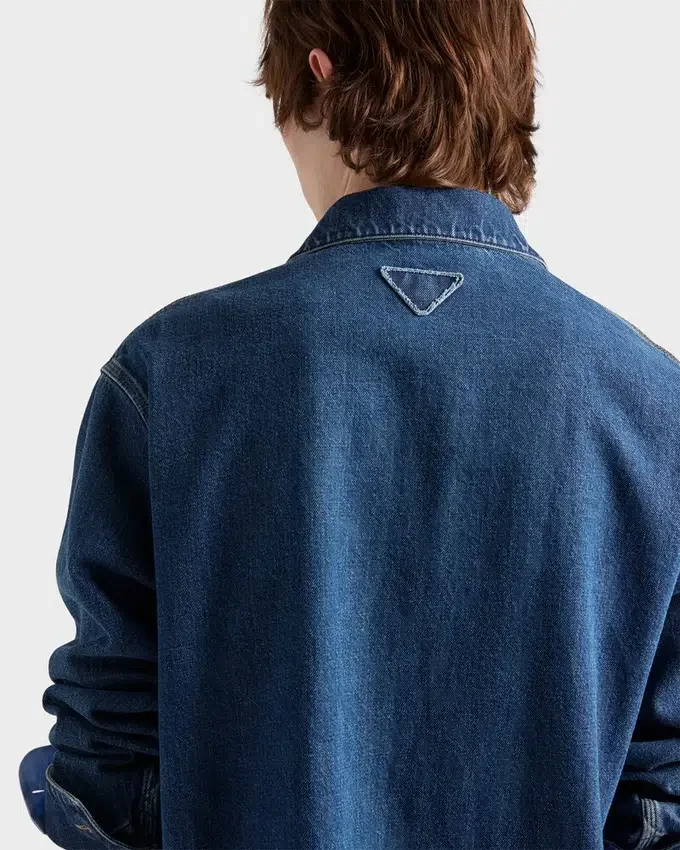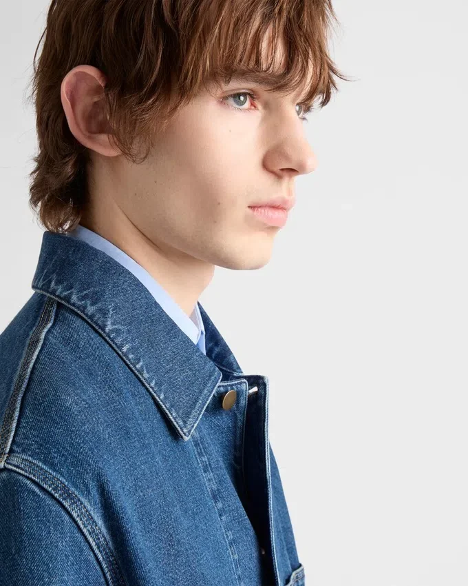 This Versatile Blouson Jacket Has a Sleek Silhouette Enriched by the Bleached Denim with a Unique Texture and Utility Details. The Casual Yet Sophisticated Garment is Completed by the Fabric Triangle Logo.