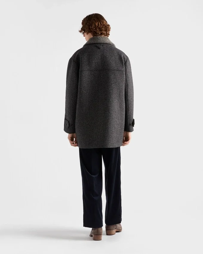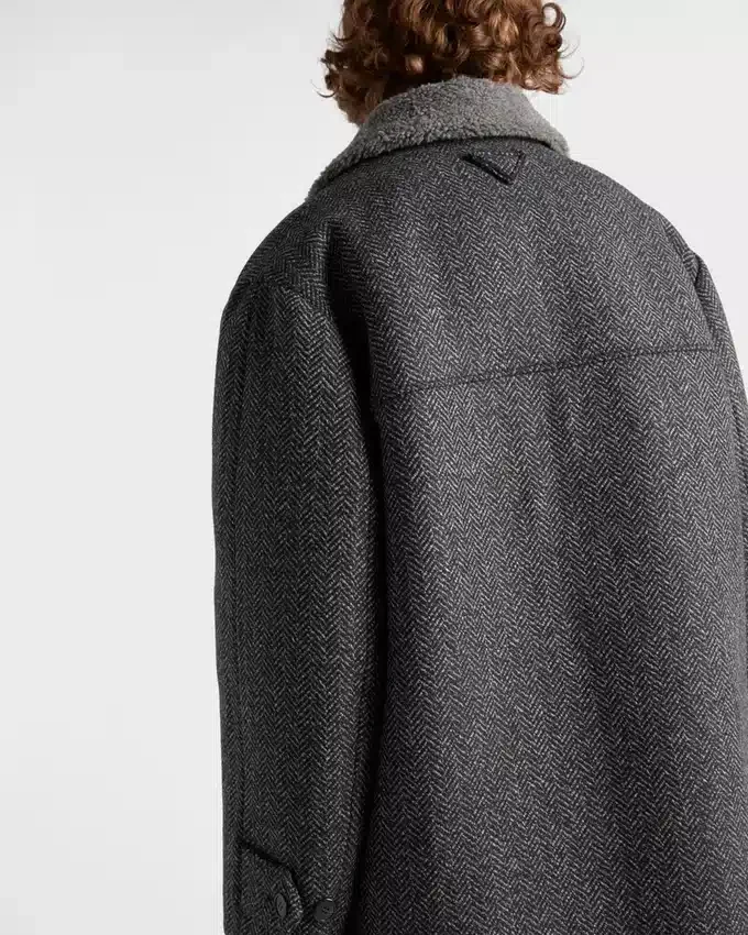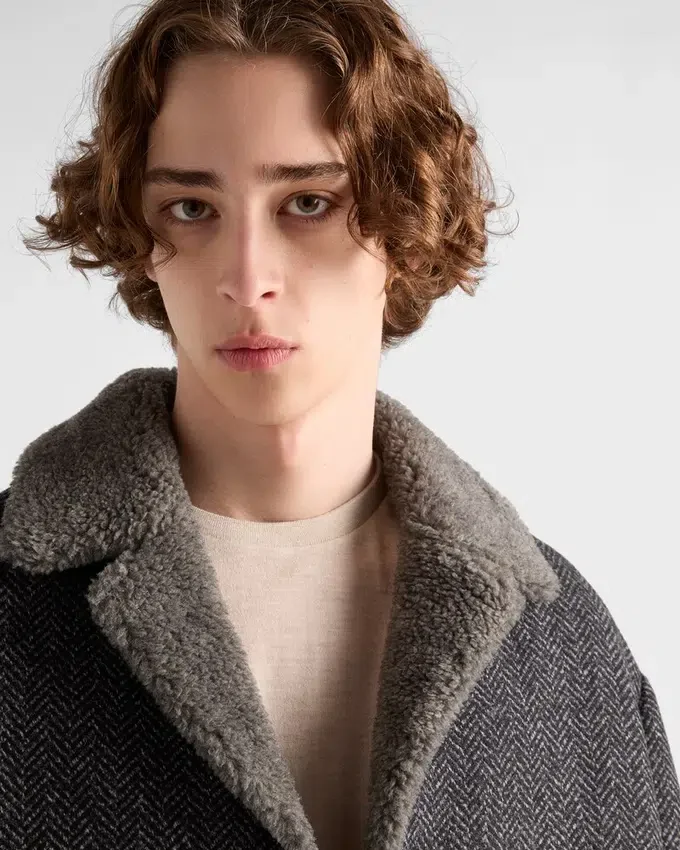 The Combination of Sophisticated Winter Textures Gives This Straight-Cut Coat a Distinctive Character. The Outerwear Made of Wool with a Chevron Pattern is Completed with a Soft Shearling Lining.