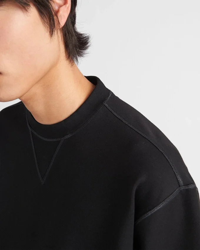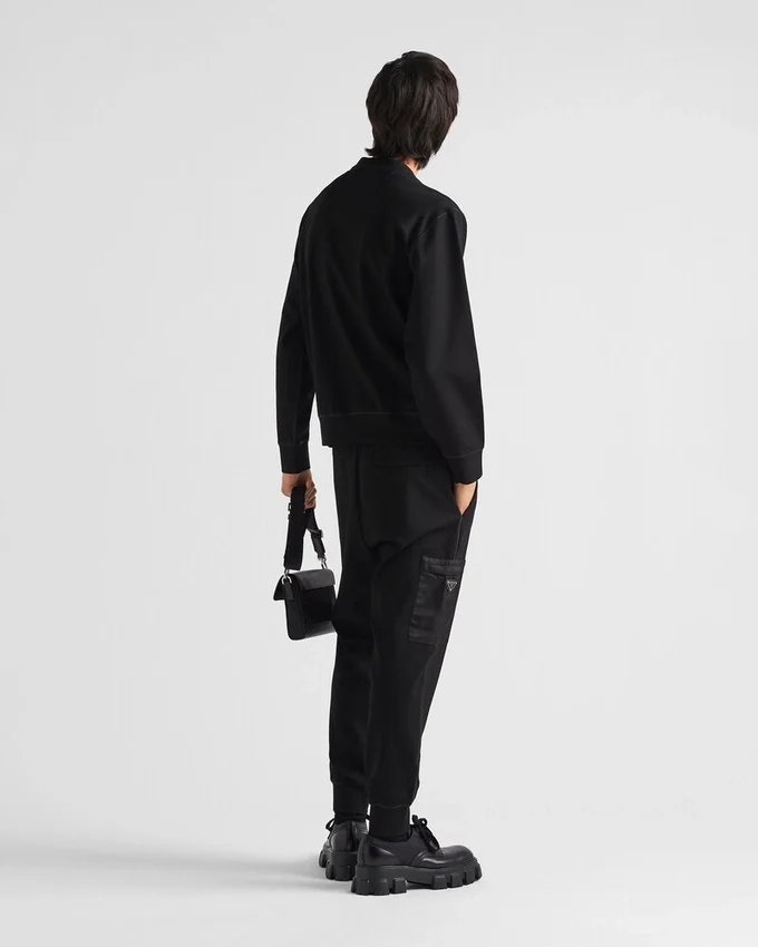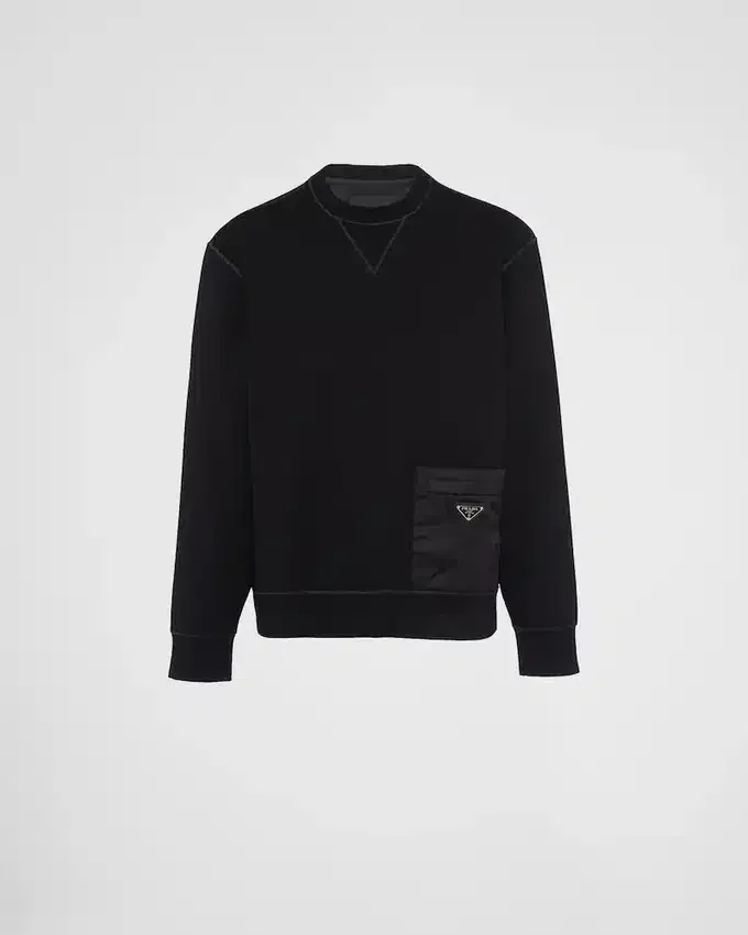 This Technical Cotton Sweatshirt is Defined by Its Contrasting Materials in the Same Shade. A Geometric Nylon Pocket with Zipper on the Front Accents the Design Decorated with the Enameled Metal Triangle Logo.