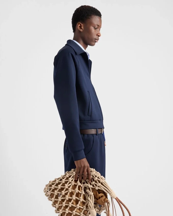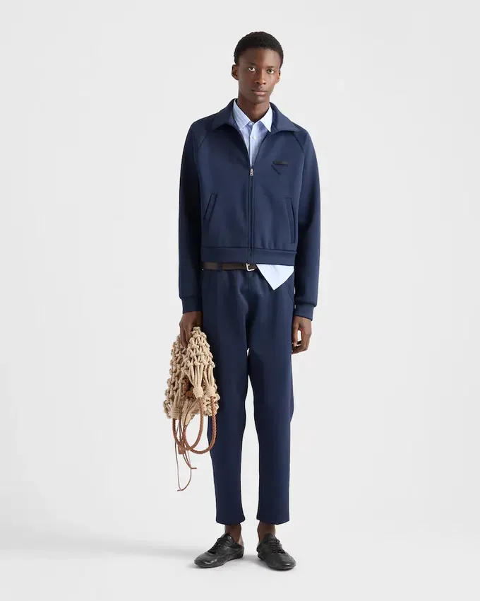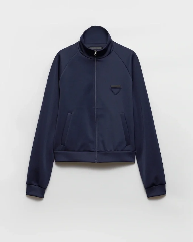 Clean Lines and Minimalist Details Define This Technical Fabric Zipper Jacket with a Structured Silhouette and Stand-Up Collar. The Triangle Logo Adds Its Signature Touch to the Sleek, Contemporary Design.