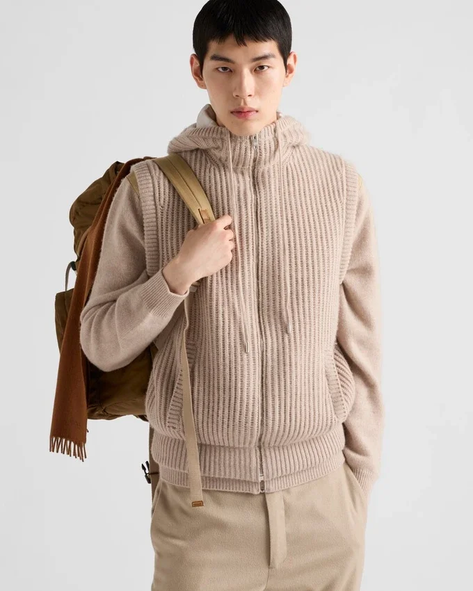 This Hoodie Vest with a Sporty Design and Refined Details is Made of Fine Ribbed Knit Cashmere.