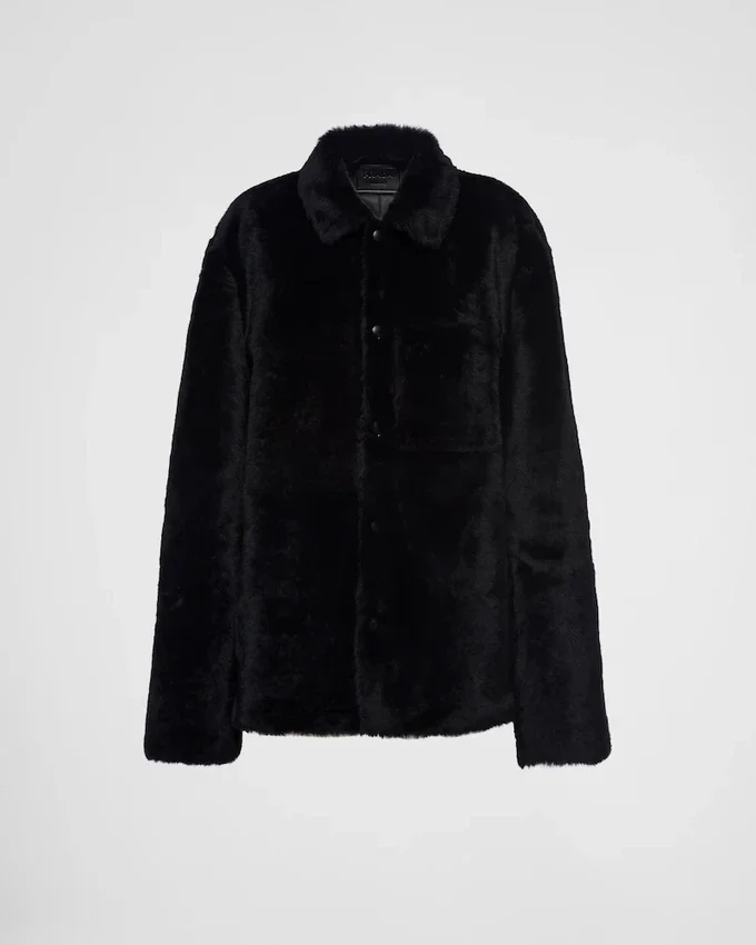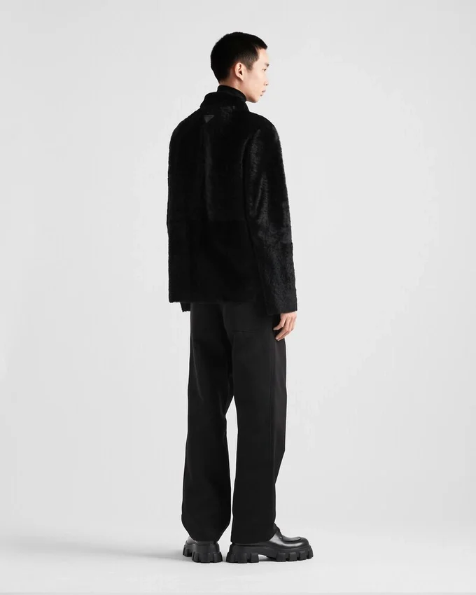 The Sleek, Classic Silhouette of the Blouson Jacket is Reinterpreted with a Refined, Contemporary Cut. The Shearling Garment with Soft Lines and an Oversized Fit is Defined by an Elegant Shirt-Style Collar and a Patch Pocket on the Front. The Leather Triangle Logo, Reinterpreted with a Conceptual Design, Completes the Refined and Modern Garment with Its Distinctive Signature Touch.