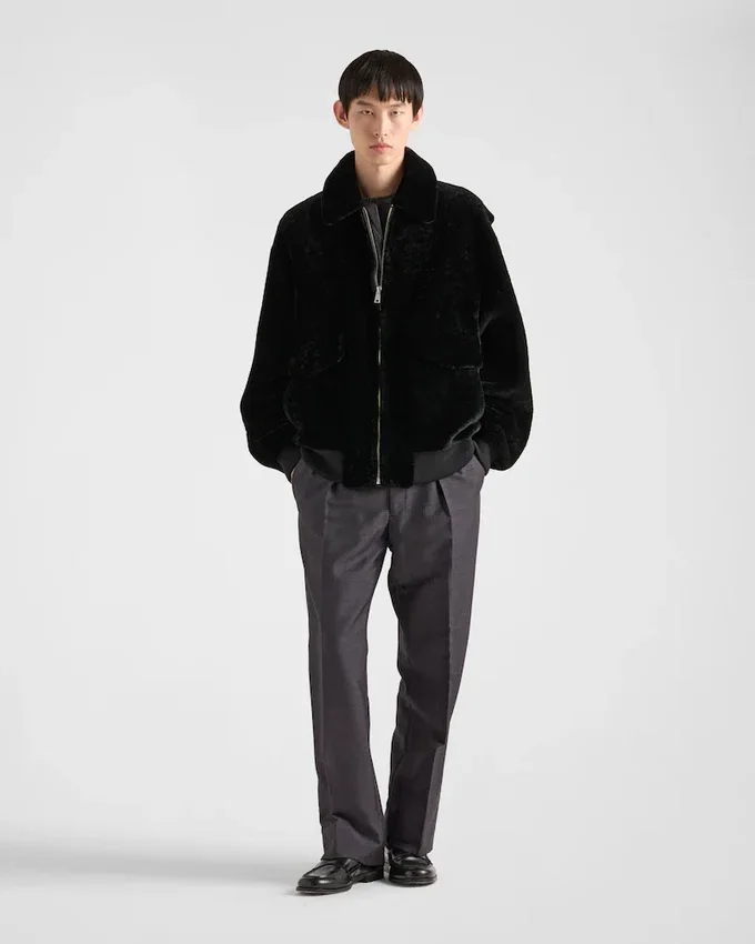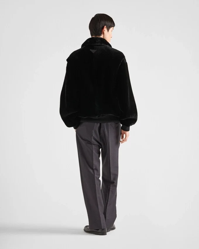 Soft, Oversized Lines Define This Bomber Jacket with a Sporty Design Made of Shearling That Emphasizes the Volume of the Garment, Decorated with the Tonal Leather Triangle Logo.
