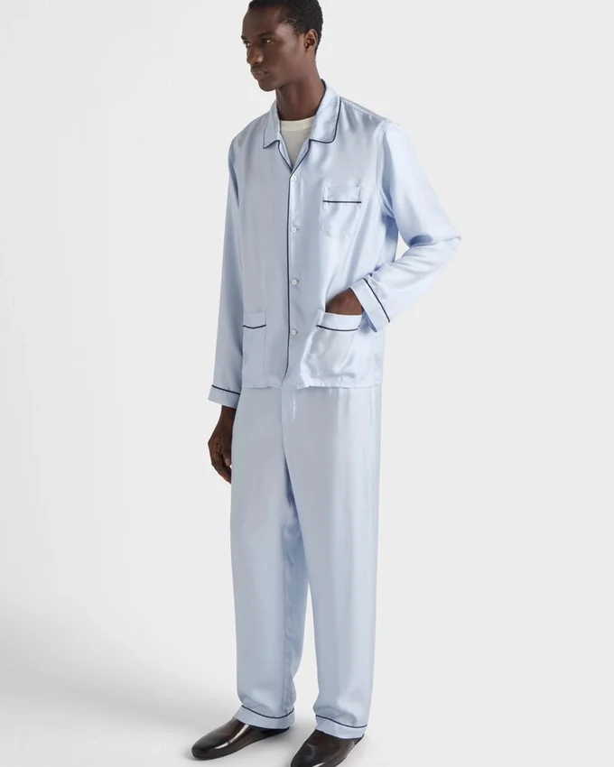 These Pajamas with a Classic Cut Combine Sophistication and Comfort. The Style Made of Fine Silk Features Mother-Of-Pearl Buttons and Contrasting Piping.