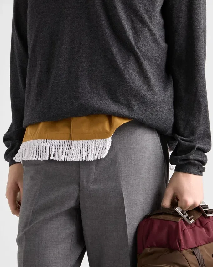 A Change of Tone Redefines Classics from the Prada Wardrobe Like the Bowling Shirt Presented with Original, Retro-Inspired Details. The Lighthearted Freedom of the Season is Translated into a Lightweight, Boxy Silhouette with Fringe on the Hem.