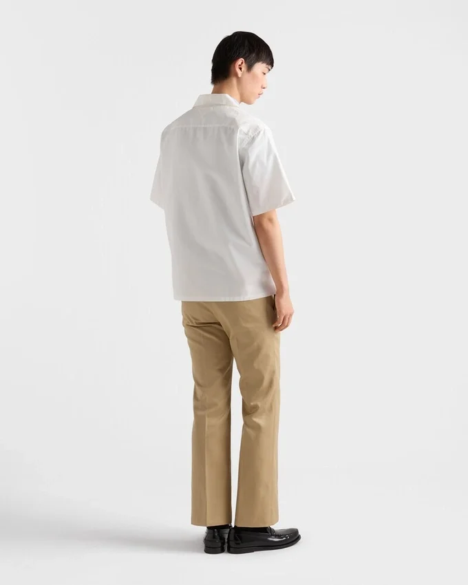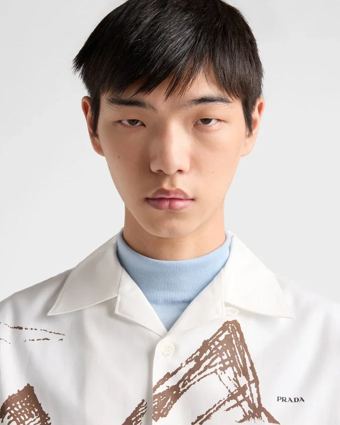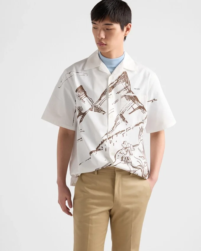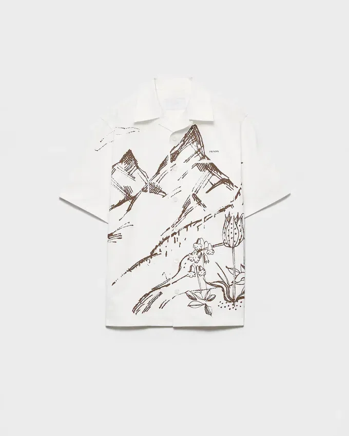 The Serene and Dynamic Energy of Nature is Captured in a Print with Light and Delicate Lines That Embellishes This Bowling Shirt. The Distinctive Silhouette of Prada Collections is Reinterpreted for the Spring/Summer 2026 Season.