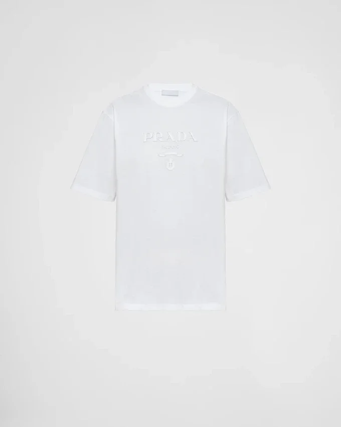 An Essential Item of the Brand, the Prada Jersey T-Shirt Embodies the Luxury of Simplicity That Becomes an Attitude and Search to Reinvent the Bases and Propose New Meanings. The Design is Accented with the Brand’s Emblematic Lettering Logo Presented Here in a Silicone Version.