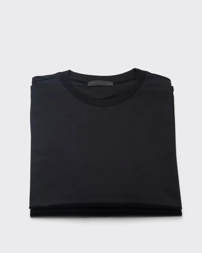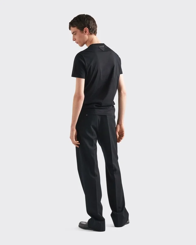This Short-Sleeved Cotton T-Shirt with Ribbed Knit Crew Neck Has a Slim Fit. The Garment is Decorated with the Iconic Sartorial Label Accompanied by the Emblematic Triangle Logo Presented in a Conceptual Version as a Fabric Patch.