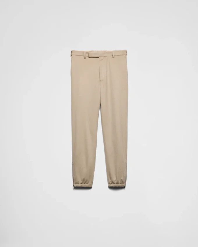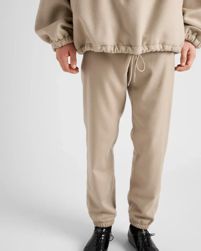 These Soft Cashmere Pants with a Hybrid Silhouette Blending Elegant Tailoring and a Sporty Style Are Decorated with the Iconic Geometric Signature Touch of the Triangle Logo.