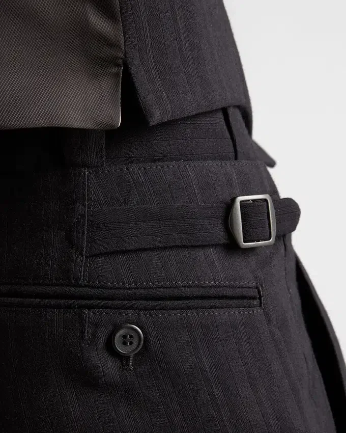 These Wool Blend Pants with a Pinstripe Motif Have a Classic Cut and Refined Details. Fine Tailoring and a Sophisticated Silhouette and Materials Define an Elegant Garment with Distinctive Style.