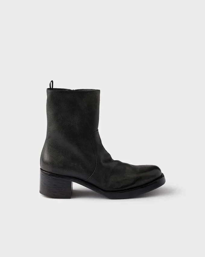 Balancing Structure and Fluidity, These Booties Reinterpret the Bold Style of ’70S Footwear with Contemporary Lines and Innovative Details. Unusual Combinations Define the Distinctive Design, Characterized by a Round Toe with Emphasized Volumes That Ends in a Slim Boot Leg. The Aged Leather Gives Depth and Uniqueness to the Footwear, an Expression of an Authentic and Instinctive Style.