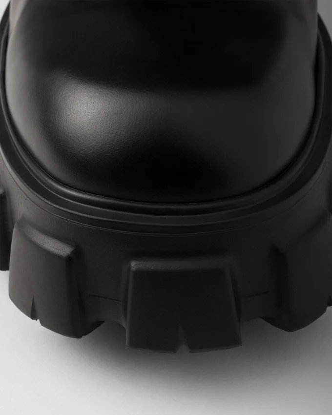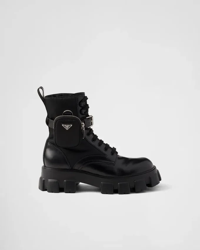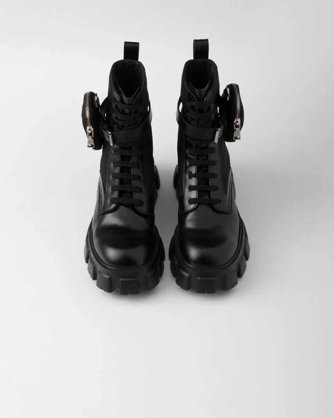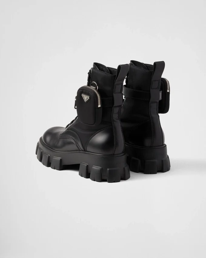 These Brushed Leather and Nylon Boots Are Decorated with a Versatile Pouch That Recalls a Multi-Pocket Design. The Formal Rigor of the Uniform Inspires This Shoe, an Expression of a Timeless Design, Monolithic and Unique, That Reinterprets the Dual Soul of Prada from a Modernist Perspective. The Maxi Sole That Defines the Bold Lines of Monolith Footwear is Combined with Elegant Brushed Leather, Emphasizing the Brand’s Desire to Create Harmony Through Diametrically Opposed Hybrid Concepts. This Product Does Not Contribute to the Sea Beyond Educational Program.