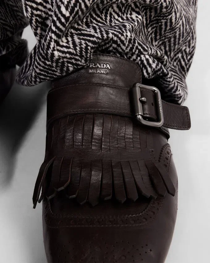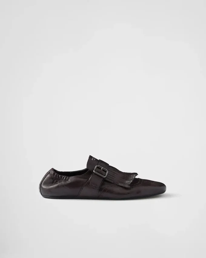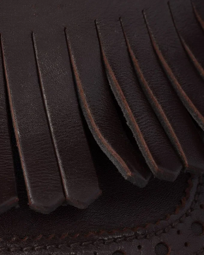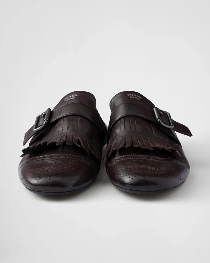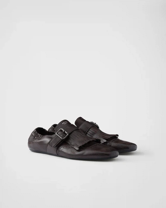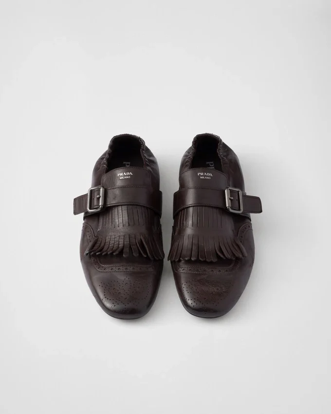 Men’s Formal Footwear is Reinterpreted with Soft and Flexible Deconstructed Silhouettes. These Monk Strap Leather Shoes with a Vintage Finish Are Enriched by Fringe and a Classic Brogue Motif, While the Thin Soles Enhance the Innovative and Contemporary Aesthetic of the Design.
