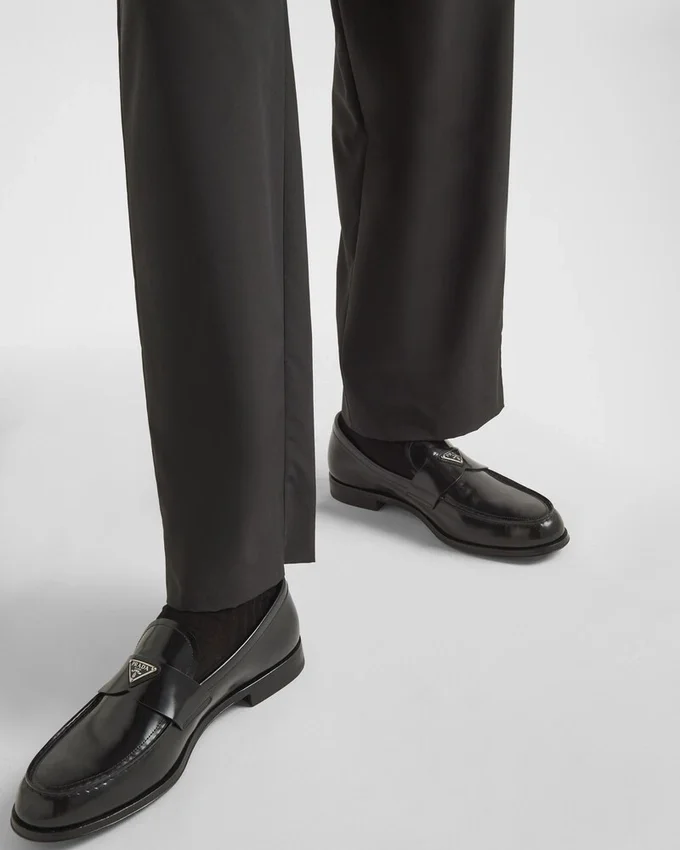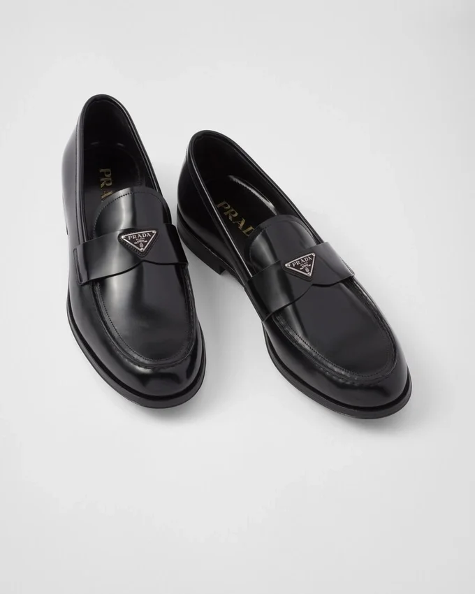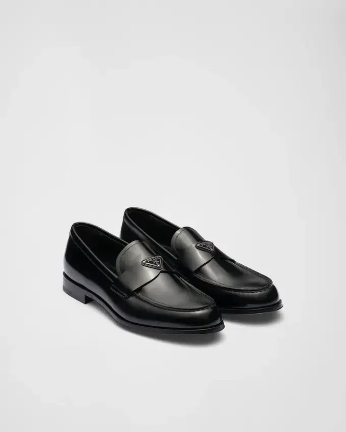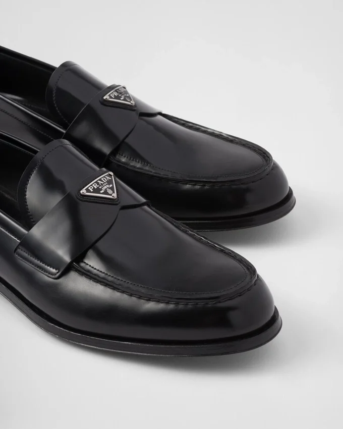 Characterized by an Elongated Line, These Brushed Leather Loafers Embody an Anachronistic Tradition with Handcrafted Elements That Encounter Modernist Allure. The Enameled Metal Triangle Logo, Which First Appeared on Trunks Designed by Mario Prada in 1913, Stands out on the Front.