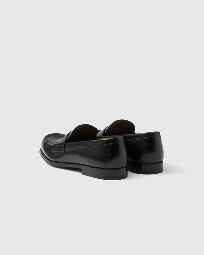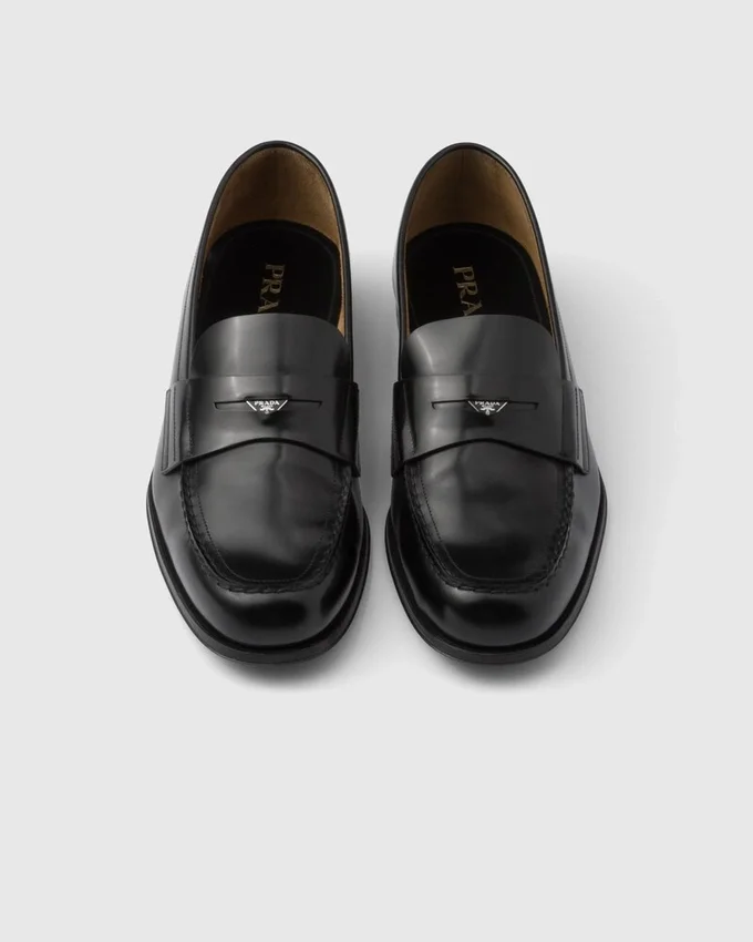 Characterized by an Elongated Line, These Brushed Leather Loafers Embody an Anachronistic Tradition with Handcrafted Elements That Encounter Modernist Allure. The Enameled Metal Triangle Logo, Which First Appeared on Trunks Designed by Mario Prada in 1913, Stands out on the Front.