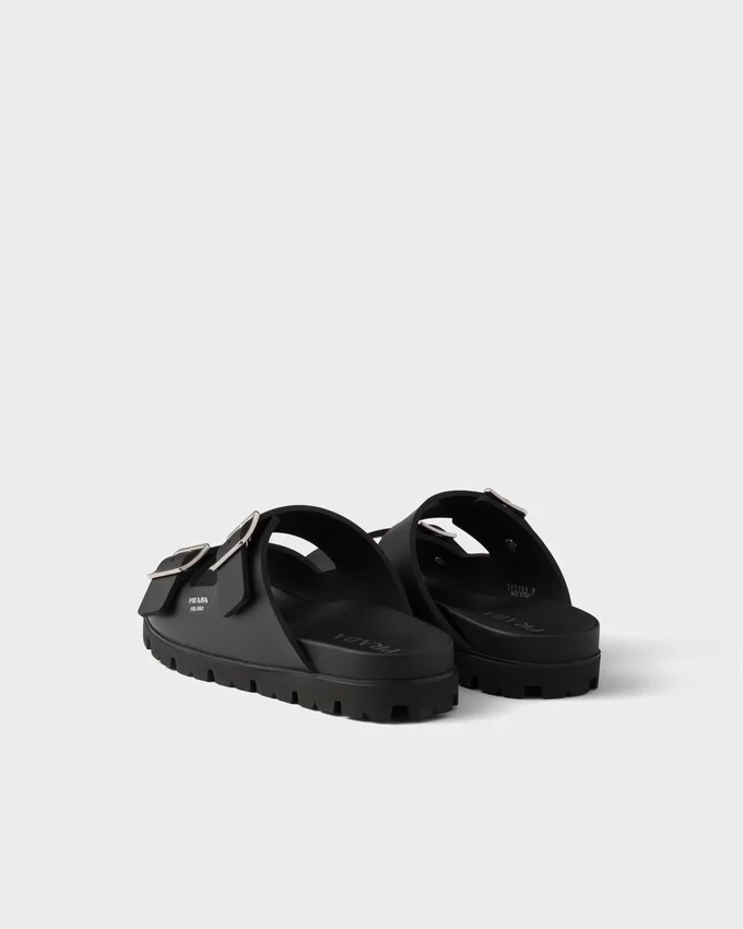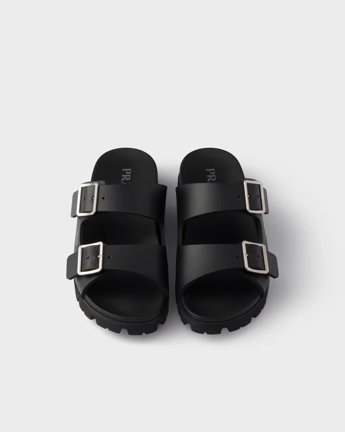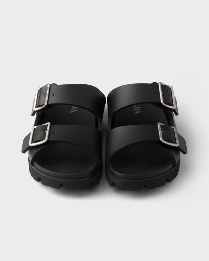 These Rubber Sandals with a Casual and Functional Design Are Characterized by Their Comfortable Strap Silhouette with Metal Buckles. Sporty Soles Complete the Sandal Decorated with the Screen-Printed Lettering Logo.