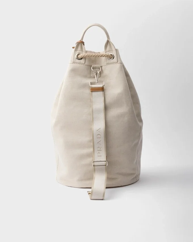 This Linen Blend Drawstring Duffel Bag with a Light, Sporty Design is Characterized by the Adjustable Shoulder Strap and Enriched with Leather Trim. The Embroidered Tonal Lettering Logo Gives the Accessory Distinctive, Timeless Style.