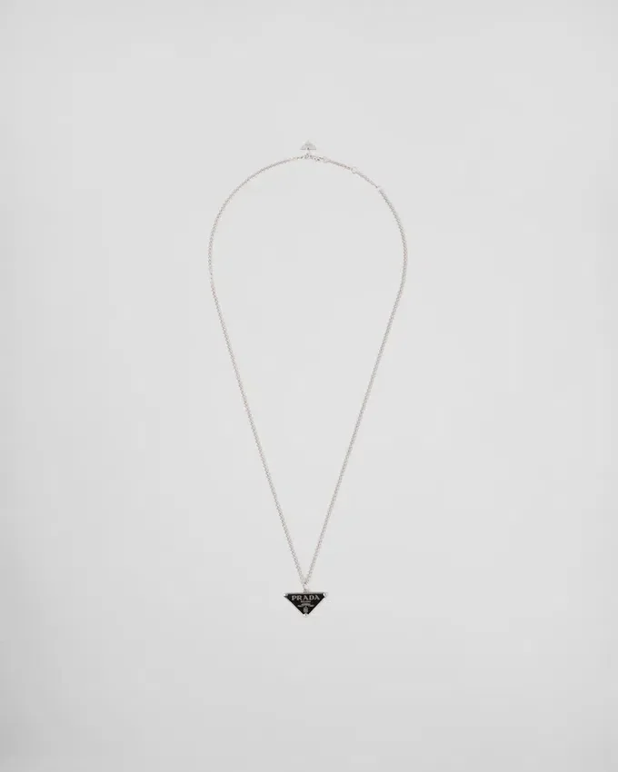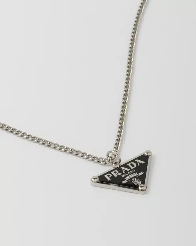 Prada’s Historic Symbol in Enamel is Found on the Pendant of This Chin Necklace with a Palladium Finish. Iconic and Sleek, the Triangle Logo is the Protagonist of a New Line of Jewelry Made of 925 Sterling Silver That Reinterprets Punk Influences in a Modern Way.