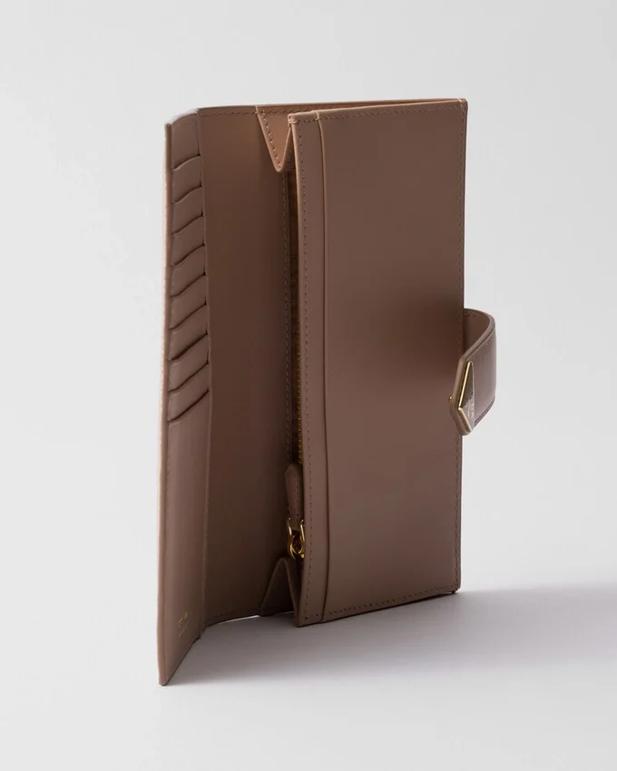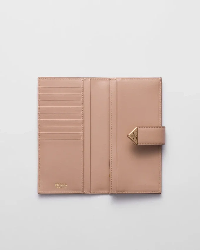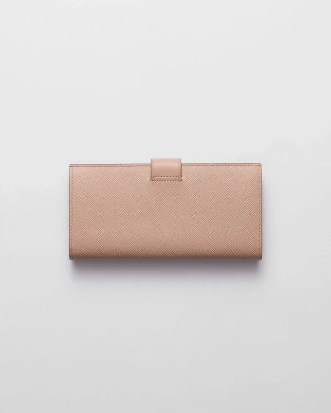 Defined by Sophisticated and Precious Allure, This Large Wallet Comes in a Mix of Details in Smooth and Saffiano Leather, an Iconic Prada Material with a Crosshatch Texture. Characterized by Its Minimalist Design and Equipped with Several Compartments and Pockets, the Accessory Features the Iconic Enameled Triangle Logo of the Brand.