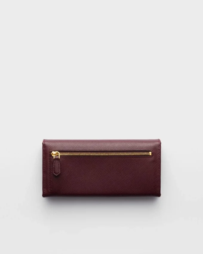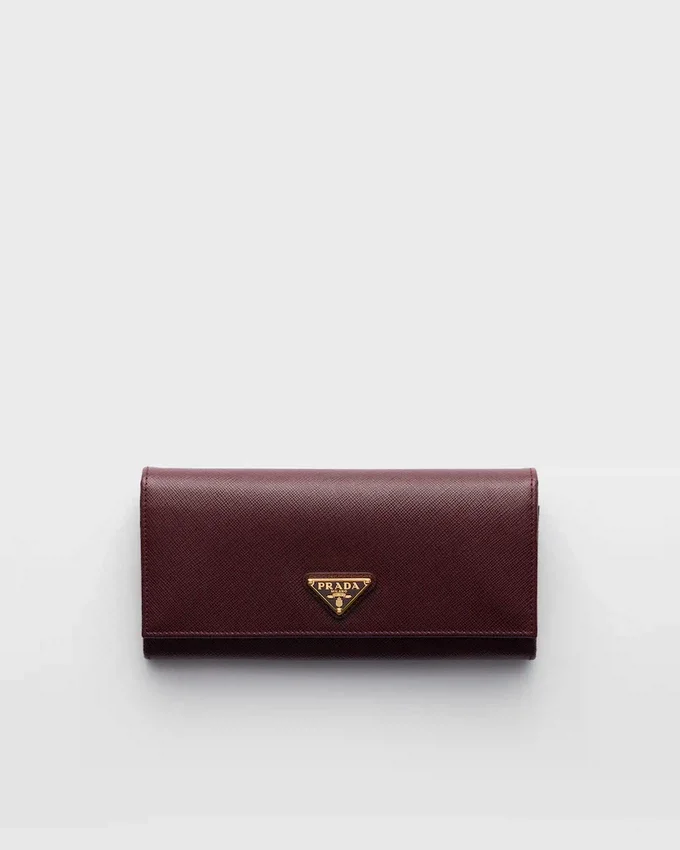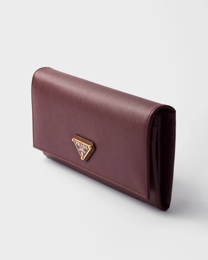 Decorated with the Triangle Prada Logo, This Flap Wallet is Crafted in Saffiano Leather. The Snap Closure Opens to Various Card Slots and Pockets.